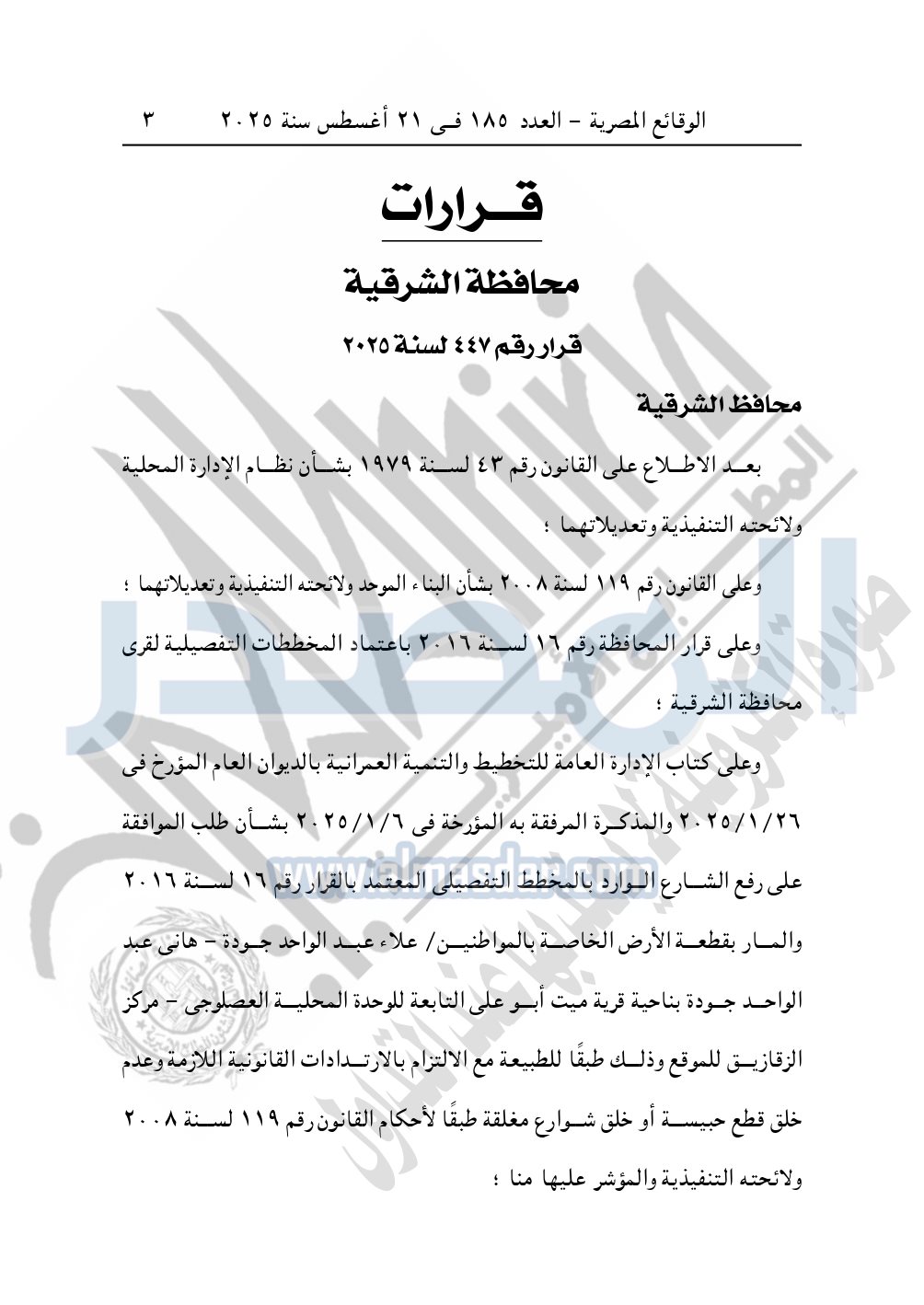 نشرت الوقائع المصرية، في العدد 185، الصادر في 21 أغسطس سنة 2025، قرار محافظة الشرقية، رقم 447 لسنة 2025، بشأن تعديل بالمخطط التفصيلي المعتمد لقرية ميت أبو على.