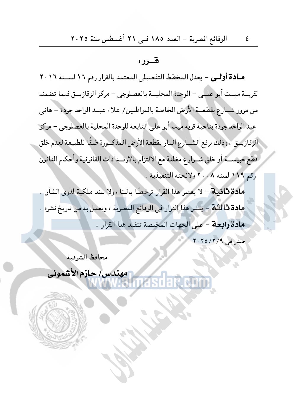 يعدل المخطط التفصيلي المعتمد بالقرار رقم 16 لسنة 2016 لقرية ميت أبو على – الوحدة المحلية بالعصلوجى - مركز الزقازيق فيما تضمنه من مرور شارع بقطعة الأرض الخاصة بالمواطنين علاء عبد الواحد جودة – هاني عبد الواحد جودة بناحية قرية ميت أبو على التابعة للوحدة المحلية بالعصلوجى – مركز الزقازيق ، وذلك برفع الشارع المار بقطعة الأرض المذكورة طبقًا للطبيعة لعدم خلق قطع حبيسة أو خلق شوارع مغلقة مع الالتزام بالارتدادات القانونية وأحكام القانون 119 لسنة 2008 ولائحته التنفيذية.