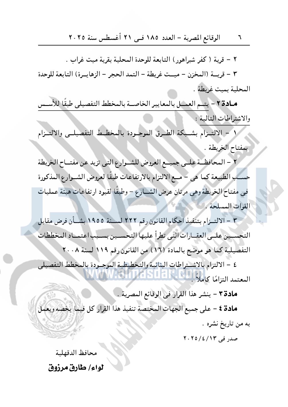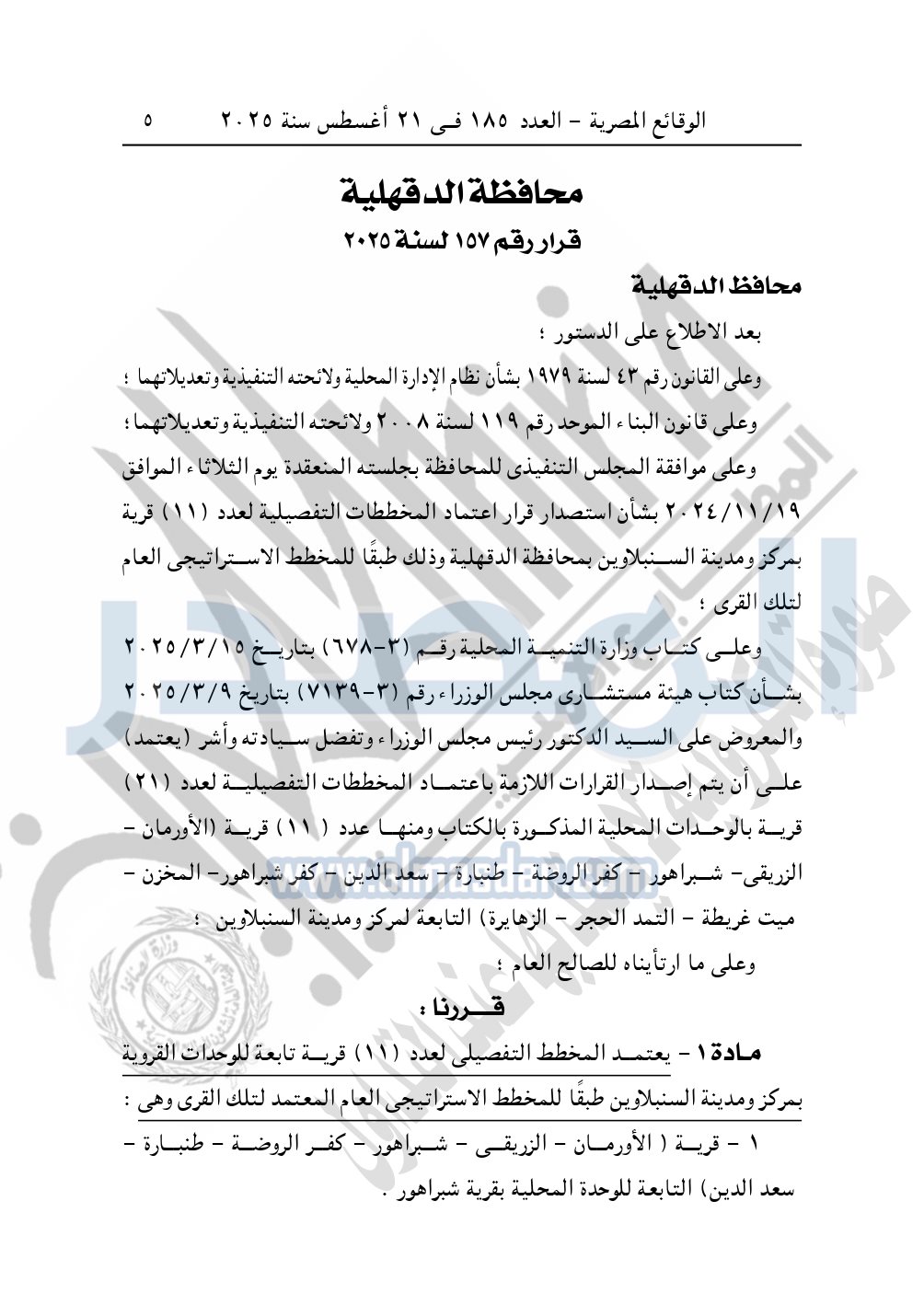 كما نشرت الوقائع المصرية، في العدد 185، الصادر في 21 أغسطس سنة 2025، قرار محافظة الدقهلية، رقم 157 لسنة 2025، بشأن إعتماد بالمخطط التفصيلى لـ"11" قرية.