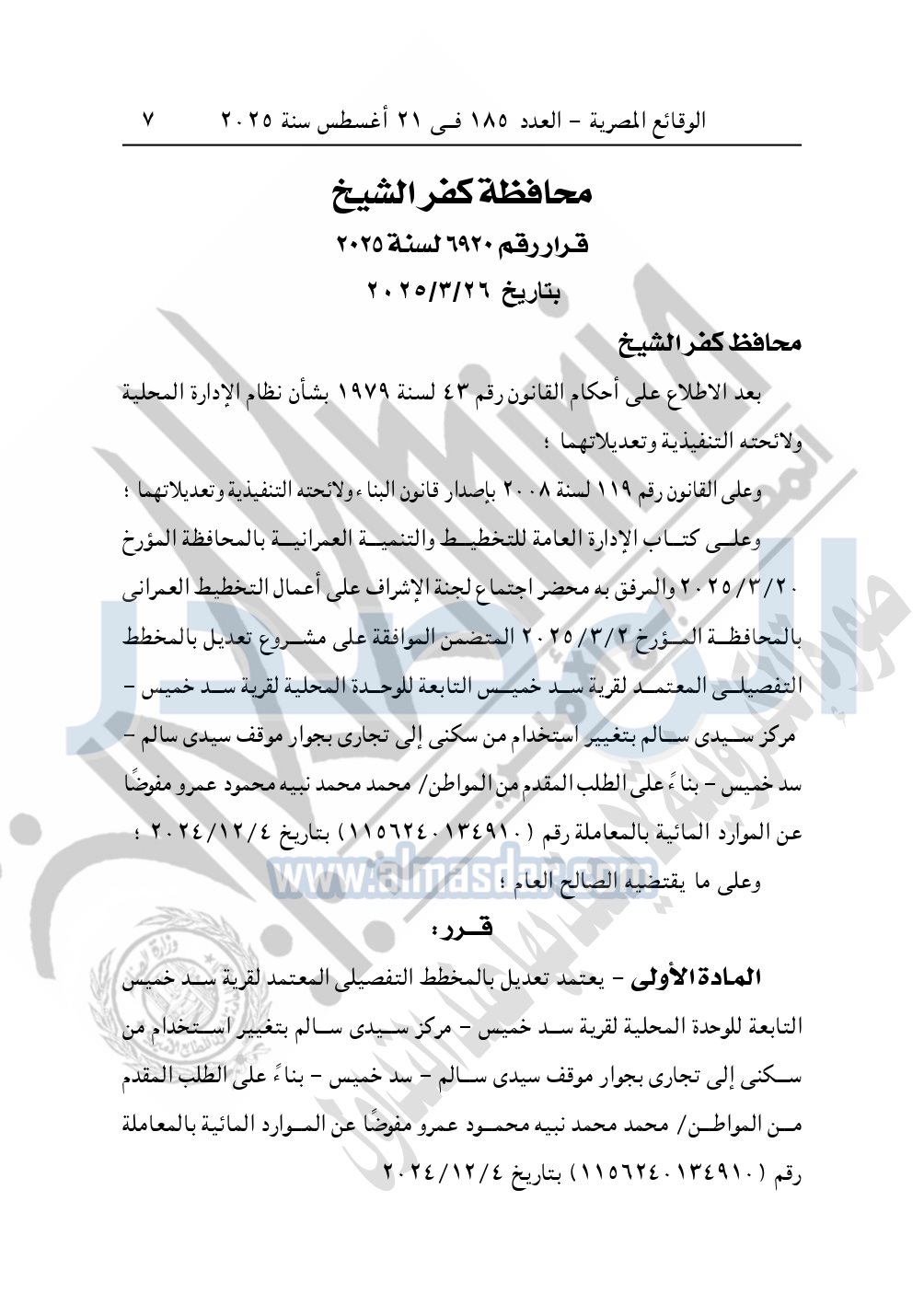 وايضا نشرت الوقائع المصرية، في العدد 185، الصادر في 21 أغسطس سنة 2025، قرار محافظة كفر الشيخ، رقم 6920 لسنة 2025، بتاريخ 26-3-2025، بشأن إعتماد تعديل بالمخطط التفصيلي المعتمد لقرية سد خمیس.