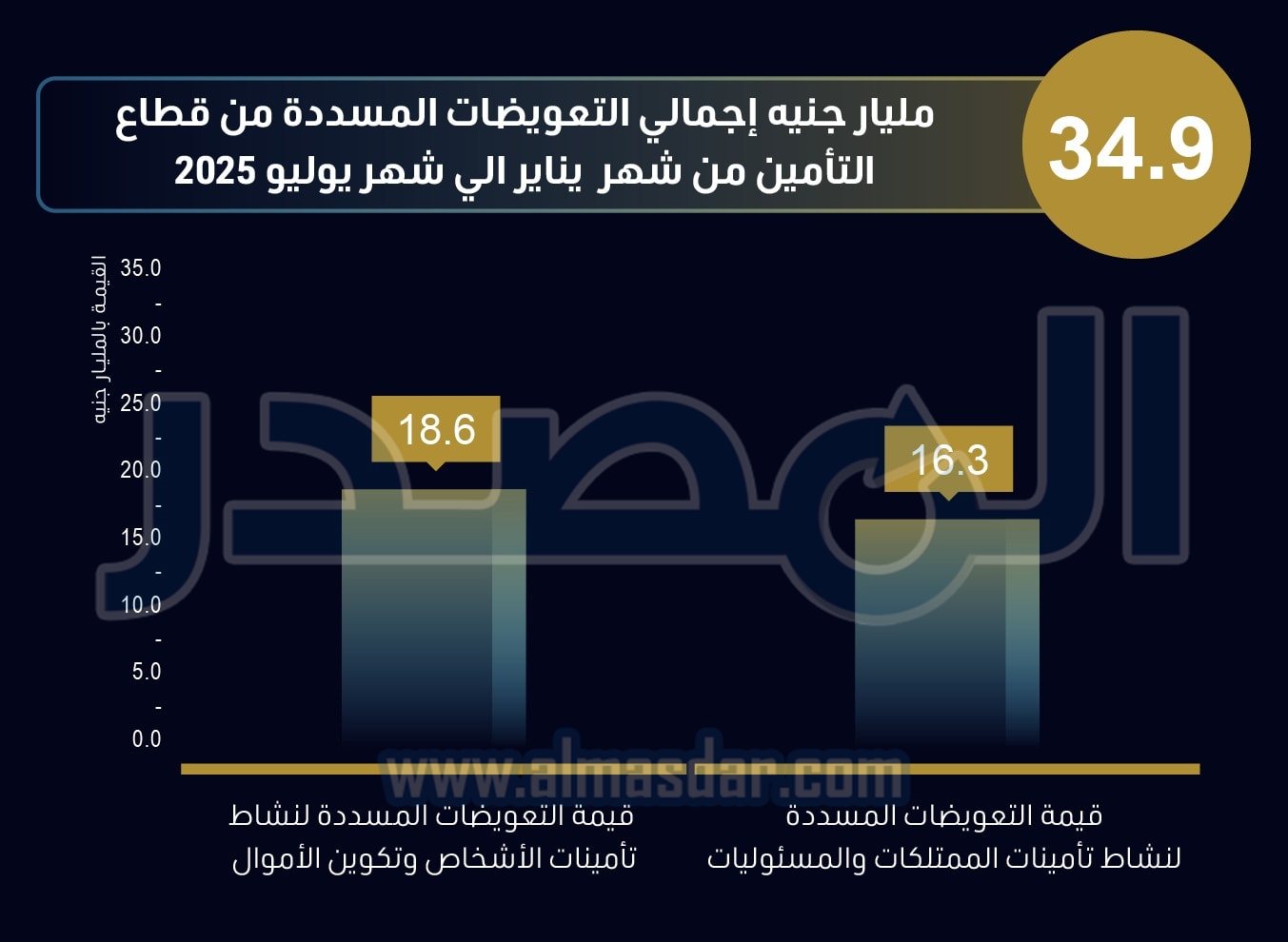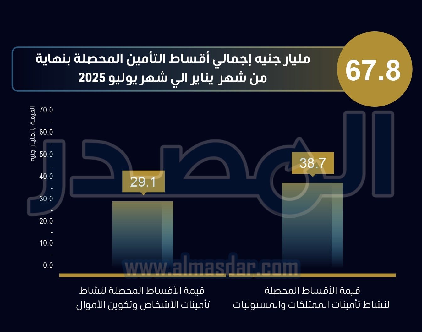 ولفت، إلى أن إجمالي أقساط التأمين المحصلة بنهاية يوليو 2025 سجل 67.8 مليار جنيه، فيما بلغ إجمالي التعويضات المسددة من قطاع التأمين 34.9 مليار جنيه، بالإضافة إلى 16.9 مليار جنيه استثمارات صناديق التأمين الخاصة.