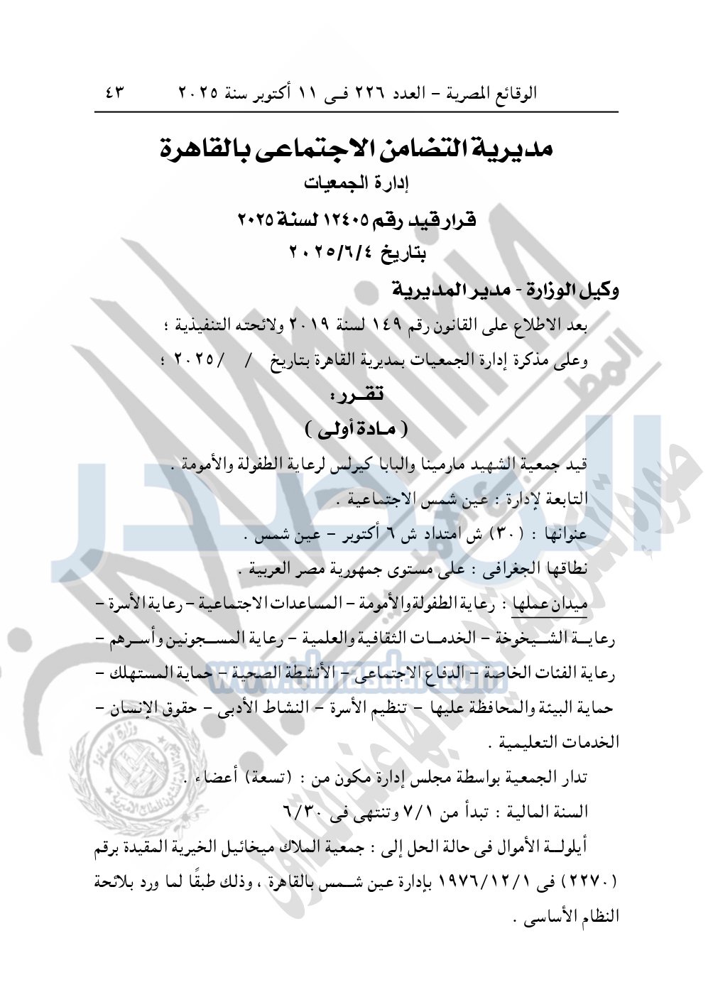 نشرت الوقائع المصرية في العدد 226، بتاريخ 11 أكتوبر 2025، قرار مديرية التضامن الاجتماعي بالقاهرة، قيد رقم 12405 لسنة 2025، بتاريخ 4-6-2025، بشأن قيد جمعية الشهيد مارمينا والبابا كيرلس لرعاية الطفولة والأمومة.
