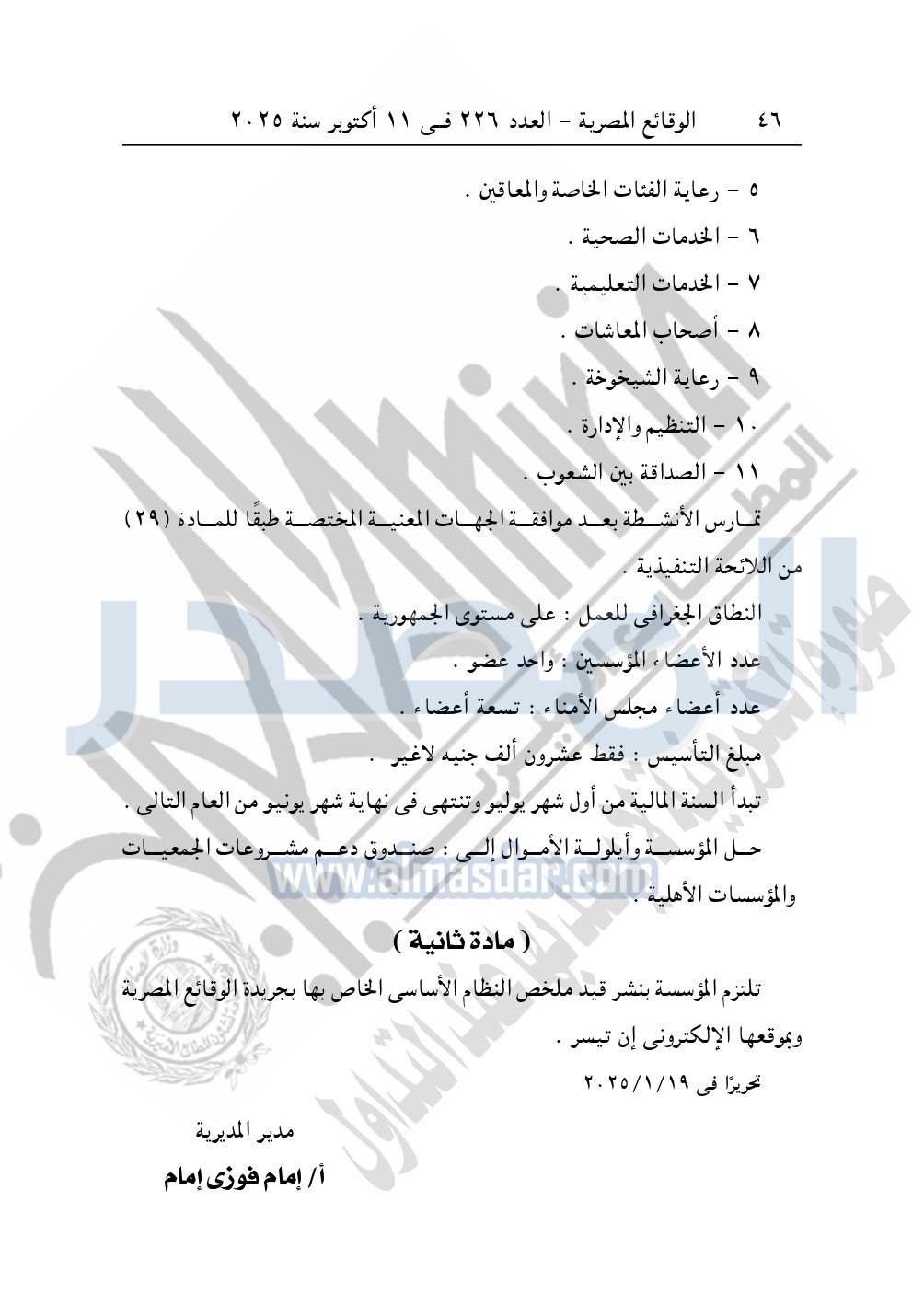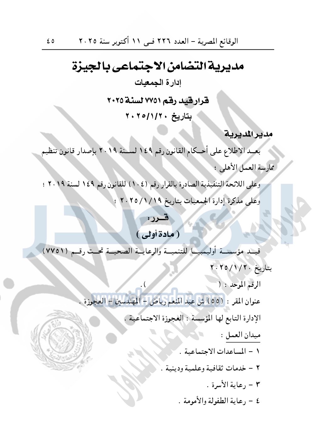 كما نشرت الوقائع المصرية في العدد 226، بتاريخ 11 أكتوبر 2025، قرار مديرية التضامن الاجتماعي بالجيزة، قيد رقم 7751 لسنة 2025، بتاريخ 20-1-2025، بشأن قيد مؤسسة أوليمبيا للتنمة والرعاية الصحية.