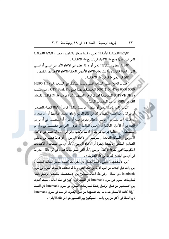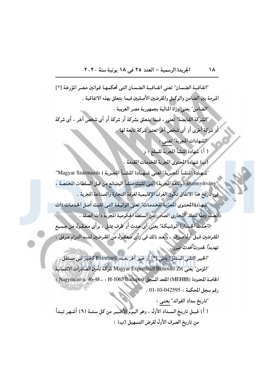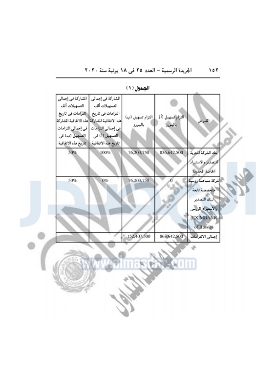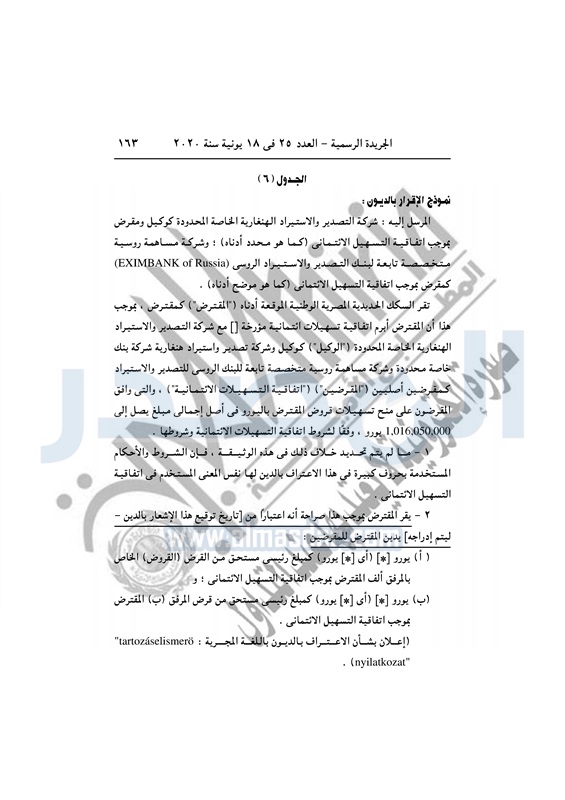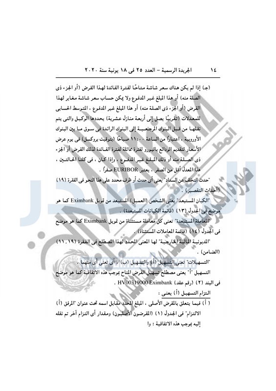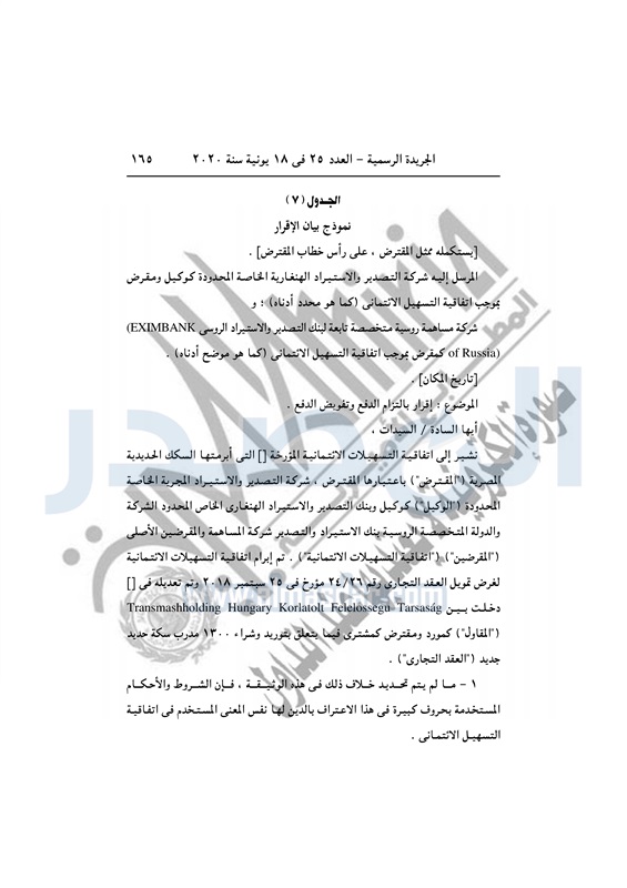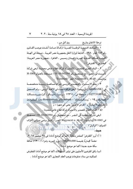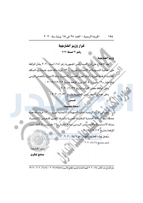 نشرت الجريدة الرسمية في العدد رقم 24 مكرر "ج" بتاريخ 17 مايو 2020، قرار رئيس الجمهورية رقم 14 لسنة 2020 ، بالموافقة على اتفاقية التسهيلات الائتمانية لتوريد 1300 عربة سكة حديد جديدة بين السكك الحديدية الوطنية المصرية والبنك المجري للتصدير والاستيراد، وبنك الاستيراد والتصدير الروسي بمبلغ مليار و16 مليونا و50 ألف يورو والموقعة بتاريخ 12 ديسمبر 2019.