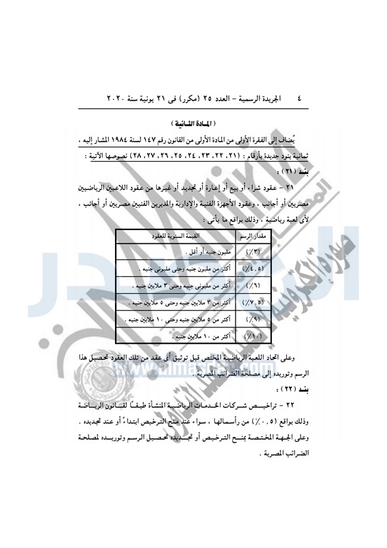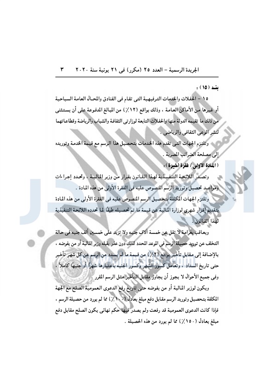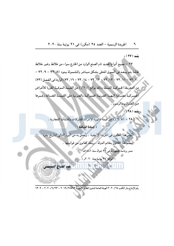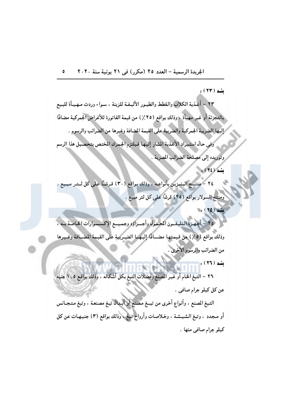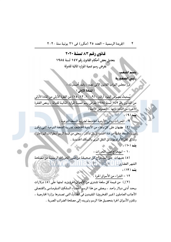 نشرت الجريدة الرسمية في العدد رقم 25 مكرر بتاريخ 21 يونيو 2020، قرار رئيس الجمهورية بالتصديق على القانون رقم 83 لسنة 2020، بتعديل بعض أحكام القانون رقم 147 لسنة 1984 بفرض رسم تنمية الموارد المالية للدولة.