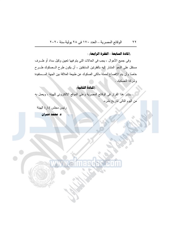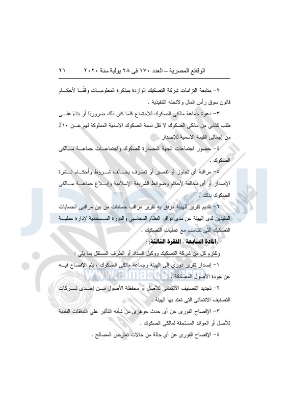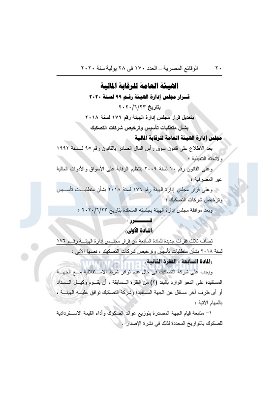 نشرت الوقائع المصرية في العدد رقم 170 بتاريخ 28 يوليو 2020، قرار مجلس إدارة الهيئة العامة للرقابة المالية رقم 99 لسنة 2020، بتاريخ 23-6-2020 ، بتعديل قرار مجلس إدارة الهيئة رقم 176 لسنة 2018 ، بشأن متطلبات تأسيس وترخيص شركات التصكيك.