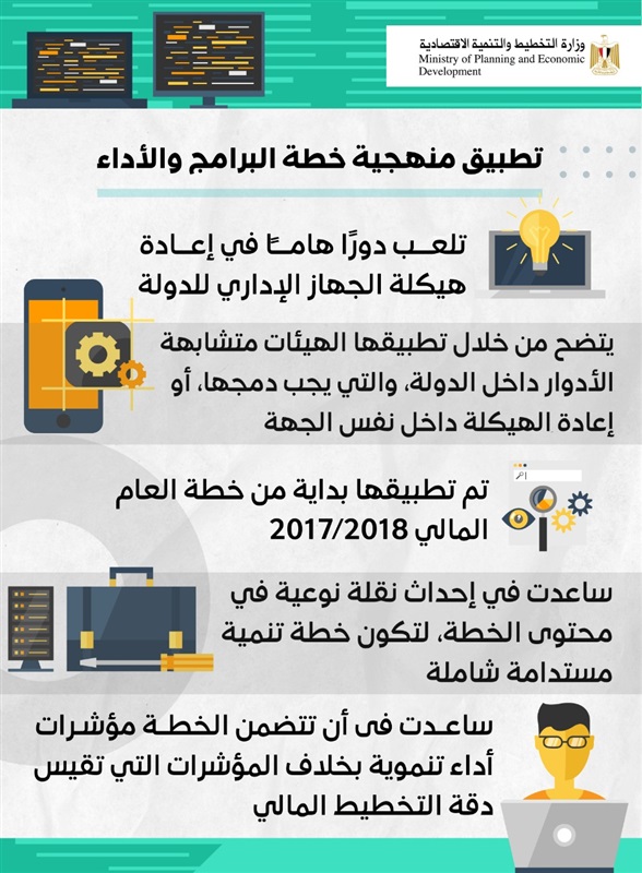 وكشف انفوجراف وزارة التخطيط والتنمية الاقتصادية أنه تم تطبيق خطة البرامج والأداء بداية من خطة العام المالي 2017-2018، حيث ساهمت في إحداث نقلة نوعية في محتوى الخطة، لتكن خطة تنموية مستدامة شاملة، وأضاف الانفوجراف أنها ساعدت كذلك في تتضمين الخطة لمؤشرات أداء تنموية بخلاف المؤشرات التي تقيس دقة التخطيط المالي.
