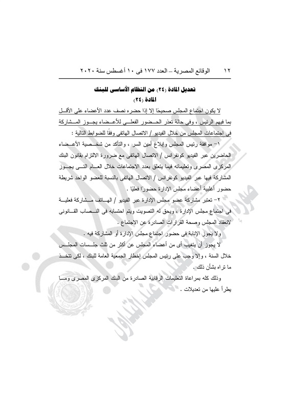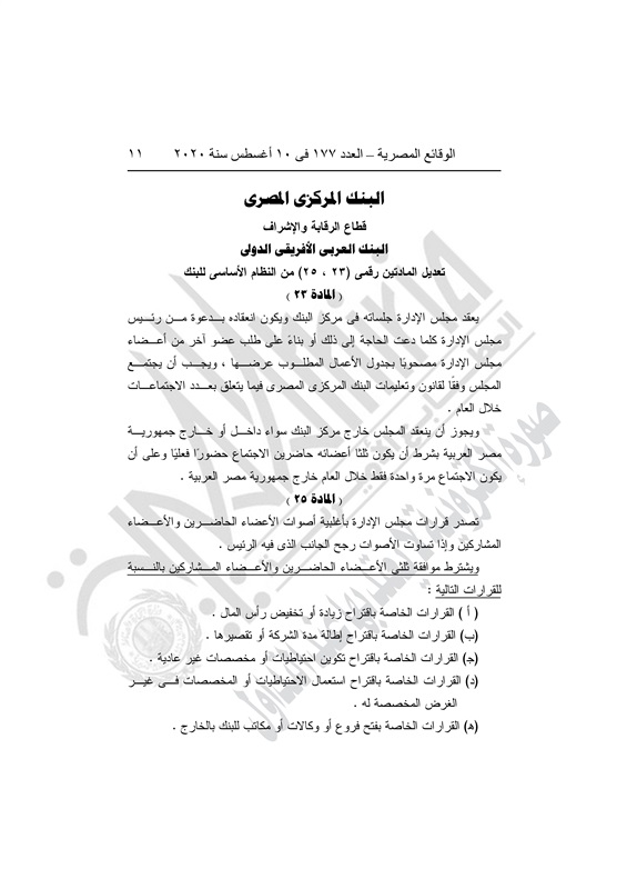 نشرت الوقائع المصرية في العدد رقم 177 بتاريخ 10 أغسطس 2020، قرار قطاع الرقابة والاشراف بالبنك المركزى المصرى ، بشأن تعديل المادتين "23،25" من النظام الأساسى للبنك العربى الأفريقى الدولى.