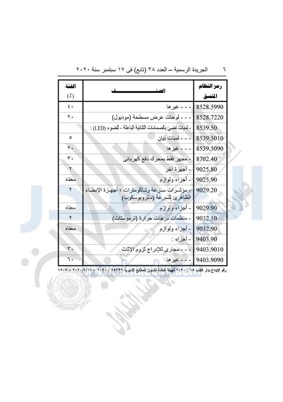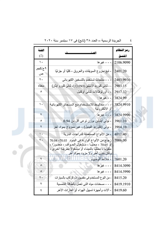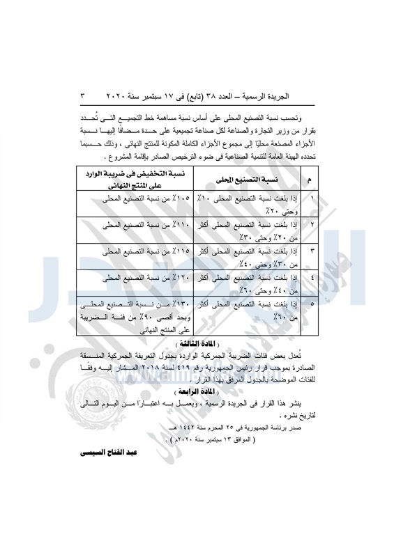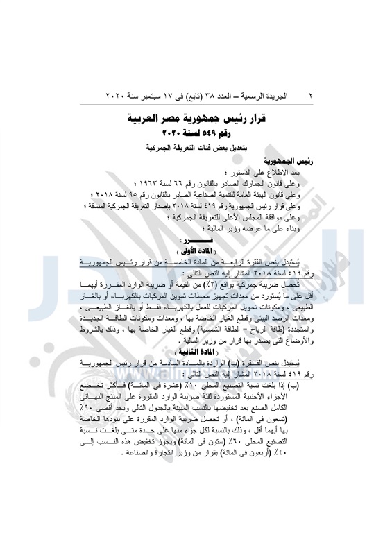 سيارات و نقل الرئيس السيسى يقرر تعديل بعض فئات التعريفة الجمركية الجمعة 18 سبتمبر 2020 - 12:26 ص 9/18/2020 12:26:00 AM الرئيس عبد الفتاح السيسى المصدر - خاص طباعة شارك نشرت الجريدة الرسمية في العدد رقم 38 تابع بتاريخ 17 سبتمبر 2020، قرار رئيس الجمهورية رقم 549 لسنة 2020، بتعديل بعض فئات التعريفة الجمركية.وفيما يلي نص القرار: طباعة شارك تابع المصدر علي جوجل نيوز تطبيق نبض
