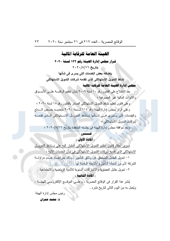 نشرت الوقائع المصرية في العدد رقم 212 بتاريخ 21 سبتمبر 2020، قرار مجلس إدارة الهيئة العامة للرقابة المالية رقم 132 لسنة 2020، بتعديل بعض الخدمات التى يسرى فى شأنها نشاط التمويل الاستهلاكى الذى تقدمه شركات التمويل الاستهلاكى.