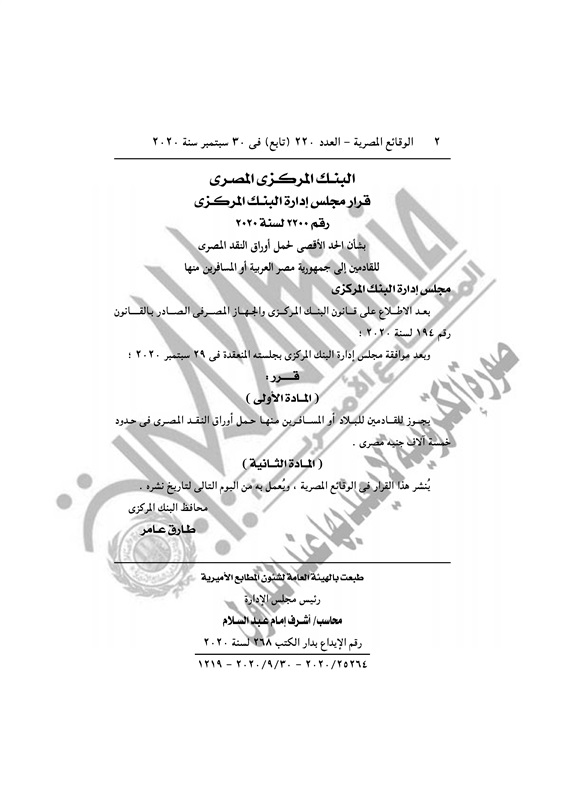 نشرت الوقائع المصرية في العدد رقم 220 "تابع" بتاريخ 30 سبتمبر 2020، قرار مجلس إدارة البنك المركزى المصرى رقم 2200 لسنة 2020، بشأن الحد الأقصى لحمل أوراق النقد المصرى للقادمين إلى جمهورية مصر العربية أو المسافرين منها.