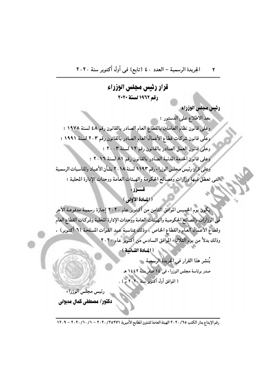 أصدر الدكتور مصطفى مدبولي رئيس مجلس الوزراء، قرارا بأن يكون يوم الخميس المقبل، الموافق الثامن من أكتوبر عام 2020، إجازة رسمية مدفوعة الأجر، في الوزارات، والمصالح الحكومية، والهيئات العامة، ووحدات الإدارة المحلية، وشركات القطاع العام، وقطاع الأعمال العام، والقطاع الخاص، بمناسبة عيد القوات المسلحة (6 أكتوبر)، وذلك بدلا من يوم الثلاثاء، الموافق السادس من أكتوبر عام 2020.