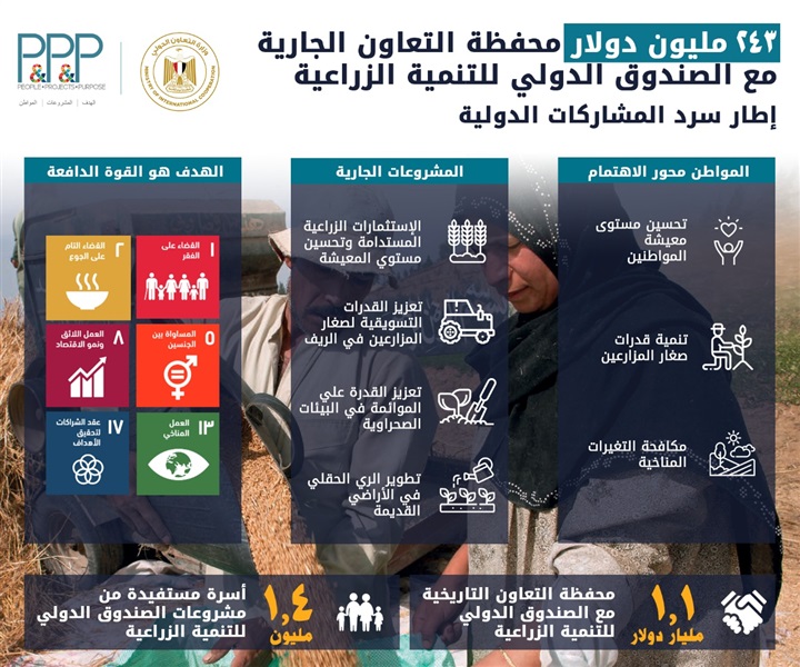 ويذكر أن وزارة التعاون الدولي، عقدت اجتماعًا ضمن منصة التعاون التنسيقي المشترك، بالتنسيق مع وزارة الزراعة، وبحضور كافة شركاء التنمية المعنيين بتمويل القطاع، لعرض المشروعات ذات الأولوية وتحديد خطوات العمل المستقبلية في أجندة التنمية الوطنية، كما تم بحث قصص النجاح المنفذة مع شركاء التنمية وتعظيمها ومعالجة التحديات القائمة، وكان الصندوق الدولي للتنمية الزراعية أحد المشاركين الأساسيين في الاجتماع .