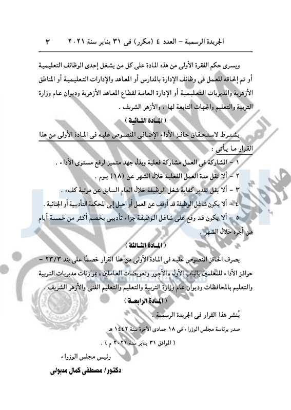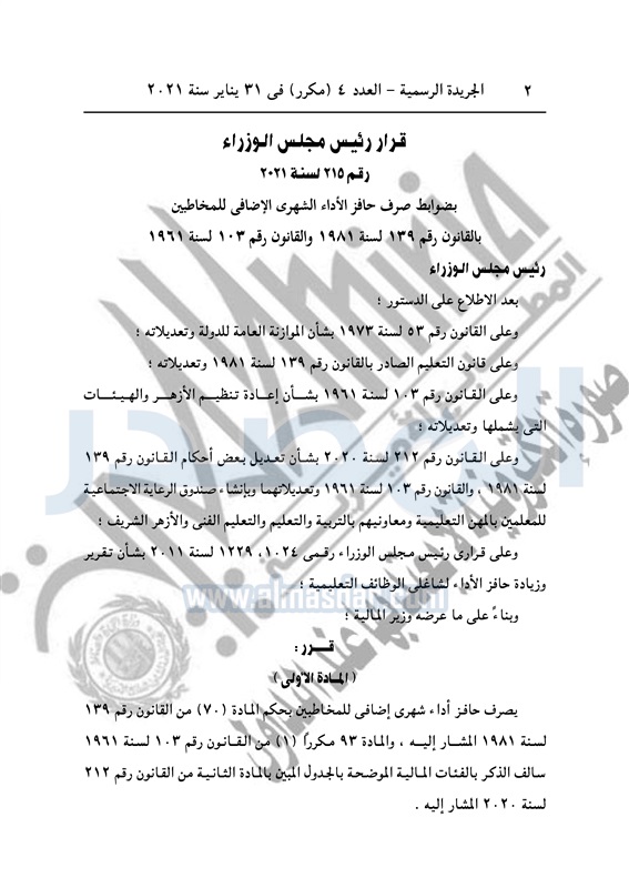 نشرت الجريدة الرسمية في العدد 4 «مكرر»، في 31 يناير سنة 2021، قرار رئيس مجلس الوزراء رقم 215 لسنة 2021، بضوابط صرف حافز الأداء الشهرى الإضافى للمخاطبين بالقانون رقم 139 لسنة 1981 ، والقانون رقم 103 لسنة 1961.