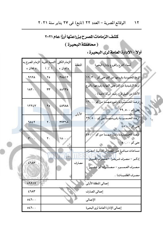 نشرت الوقائع المصرية في العدد 22 "تابع"، اليوم الأربعاء 27 يناير 2021، قرار وزارة الموارد المائية والري رقم 305 لسنة 2020 بتاريخ 28-12-2020، بشأن ترخيص زراعة الأرز لعام 2021 في المحافظات الموضحة بالكشوف المرفقة بهذا القرار بالمساحات المبينة قرين كل منها بحيث تبلغ جملة المساحة المصرح بها 724200 فدان "سبعمائة وأربعة وعشرون ألفًا ومائتا فدان".