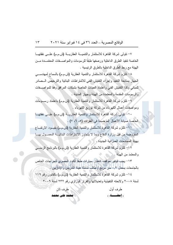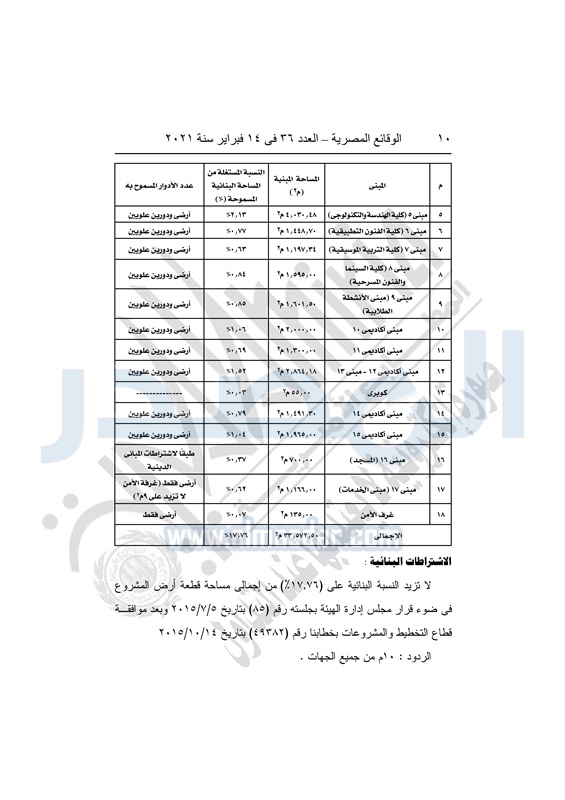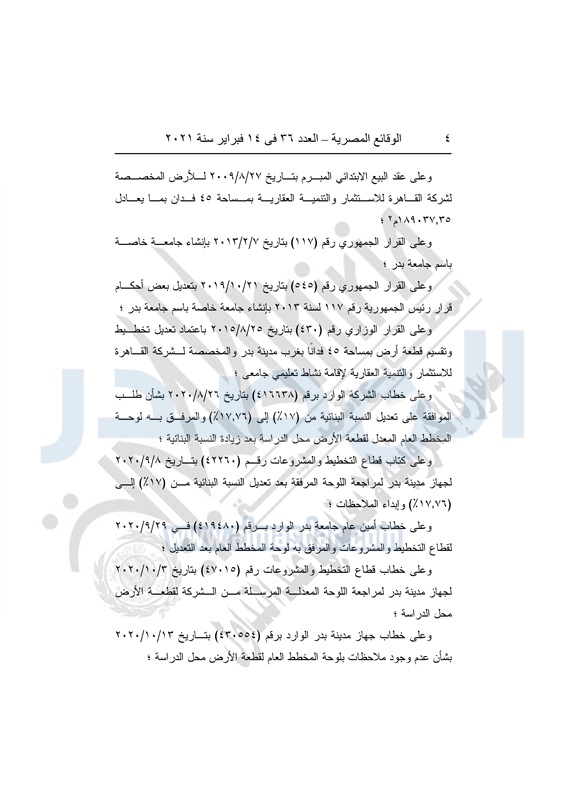 نشرت الوقائع المصرية في العدد 36، اليوم الأحد 14 فبراير، قرار وزارة الإسكان والمرافق والمجتمعات العمرانية رقم 4 لسنة 2021 بتاريخ 3-1-2021، بشأن اعتماد تعديل تخطيط وتقسيم قطعة أرض بمساحة 45 فدانًا الكائنة غرب مدينة بدر المخصصة لشركة القاهرة للاستثمار والتنمية العقارية والمقام عليها جامعة بدر بالقاهرة BUC والصادر لها القرار الوزارى رقم 430 بتاريخ 25-8-2015 .