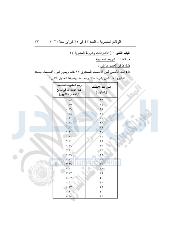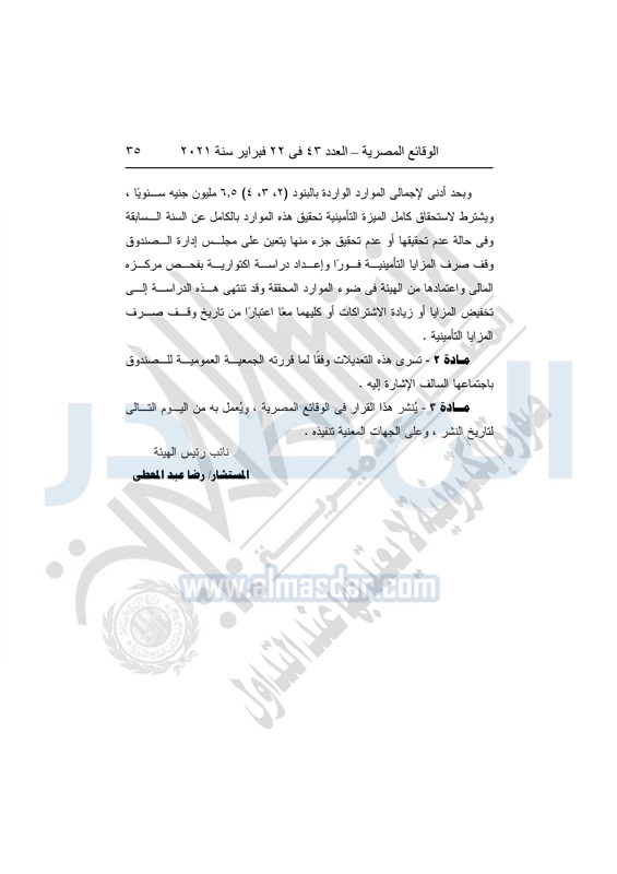 نشرت الوقائع المصرية في العدد 43، اليوم الاثنين 22 فبراير، قرار الهيئة العامة للرقابة المالية، رقم 1659، 1664 لسنة 2020 بتاريخ 28-12-2020، 30-12-2020، بشأن اعتماد تعديل لائحة النظام الأساسى لصندوق التأمين الخاص للعاملين بالشركة العامة لمنتجات الخزف والصينى، واعتماد تعديل لائحة النظام الأساسى لصندوق التأمين الخاص للعاملين بشركة الصرف الصحى بالإسكندرية.