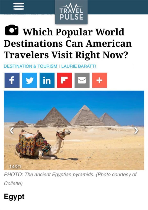 نشر موقع Travel Pulse (ترافيل بلس) الأمريكي المتخصص في السياحة والطيران تقريراً عن «الوجهات السياحية العالمية الشهيرة التي يمكن للمسافرين الأمريكيين زيارتها في الوقت الحالى»، وجاءت مصر ضمن أهم عشرين مقصدا سياحياً على مستوى العالم على استعداد لاستقبال السائح الأمريكي الآن.