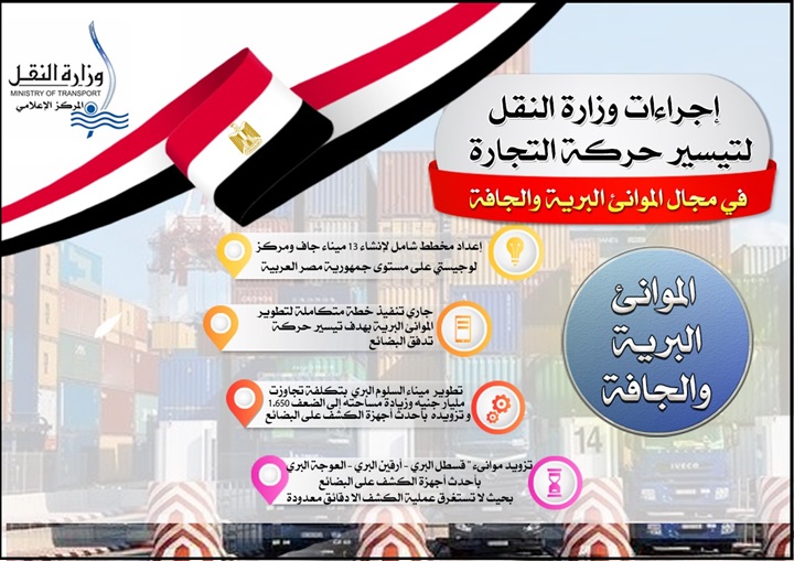 وأوضحت الوزارة أنه في مجال الموانئ الجافة ، تم إعداد مخطط شامل لإنشاء 13 ميناء جاف ومركز لوجيستي علي مستوي الجمهورية فى مدن "السادس من أكتوبر – العاشر من رمضان – برج العرب الجديدة – دمياط الجديدة – بني سويف الجديدة – سوهاج الجديدة – السادات – الطور – السلوم – قسطل – أرقين" وربطها بالموانئ البحرية بوسائل النقل المتعدد الوسائط ، بهدف تيسير حركة التجارة ومنع تكدس البضائع والحاويات بالموانئ وتحقيق التكامل بين وسائل النقل مما يسهم فى تحسين ترتيب مصر في تقرير ممارسة أنشطة الأعمال وخاصة فيما يتعلق بمؤشر التجارة عبر الحدود.