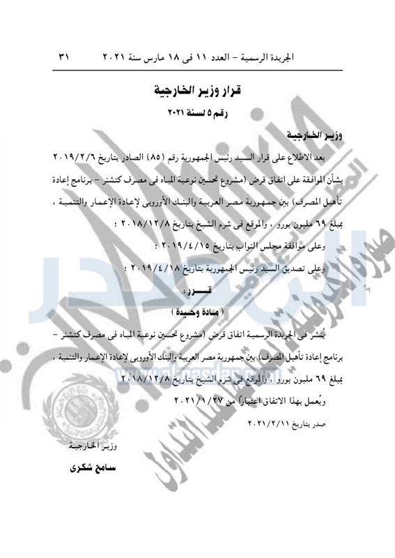 نشرت الجريدة الرسمية في العدد رقم 11 بتاريخ 18 مارس ، قرار رئيس جمهورية مصر العربية، رقم 85 لسنة 2019، بشأن الموافقة على اتفاق قرض "مشروع تحسين نوعية المياه فى مصرف كتشنر – برنامج إعادة تأهيل المصرف" بين جمهورية مصر العربية والبنك الأوروبى لإعادة الإعمار والتنمية، بمبلغ 69 مليون يورو والموقع فى شرم الشيخ بتاريخ 8-12-2018.