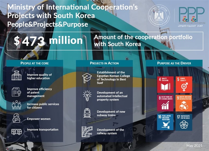ويذكر أن محفظة التمويل التنموي الجارية بين جمهورية مصر العربية وكوريا الجنوبية تسجل 473 مليون دولار، في العديد من القطاعات التنموية وهي التعليم العالي والتدريب، وتكنولوجيا المعلومات، والنقل، وغيرها من المجالات.