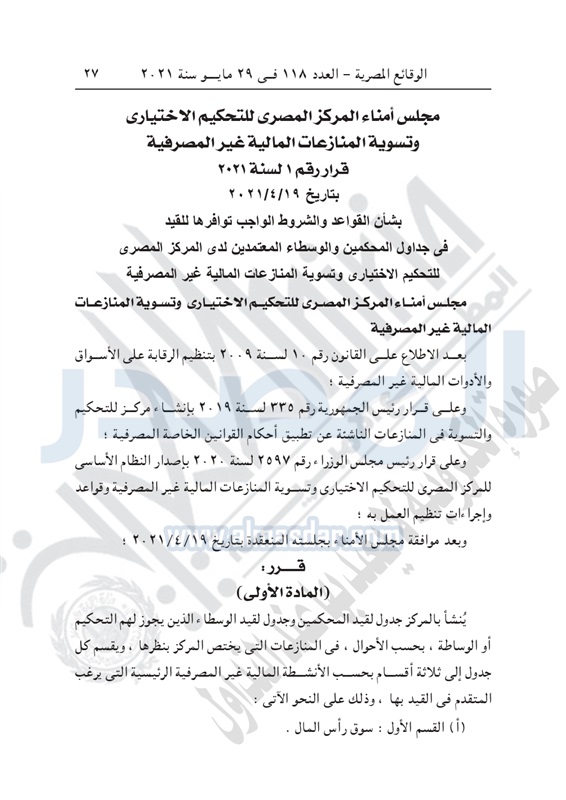 نشرت الوقائع المصرية في العدد 118، فى 29 مايو 2021، قرار مجلس أمناء المركز المصرى للتحكيم الاختيارى وتسوية المنازعات المالية غير المصرفية رقم 1 لسنة 2021 بتاريخ 19-4-2021، بشأن القواعد والشروط الواجب توافرها للقيد فى جداول المحكمين والوسطاء المعتمدين لدى مركز المصري للتحكيم الاختيارى وتسوية المنازعات المالية غير المصرفية.