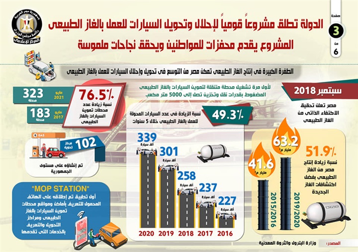 ونشر المركز الإعلامي لمجلس الوزراء في هذا الصدد ، تقريراً تضمن إنفوجرافات تسلط الضوء على المشروع القومي لإحلال وتحويل السيارات للعمل بالغاز الطبيعي، وما يقدمه من محفزات للمواطنين وما حققه من نجاحات ملموسة.