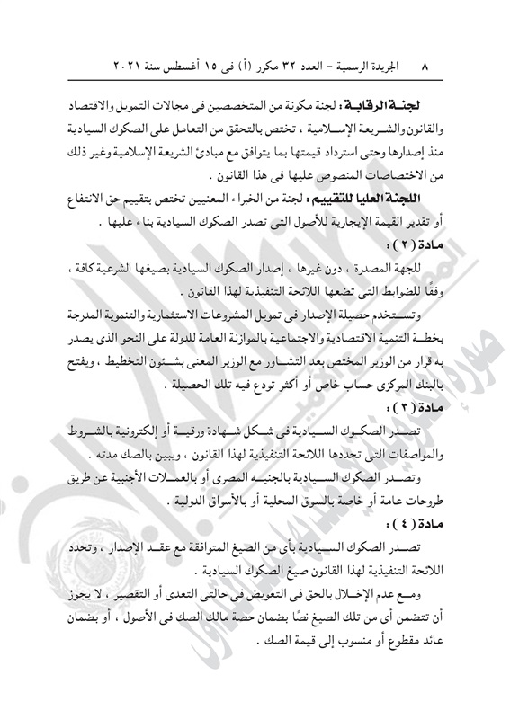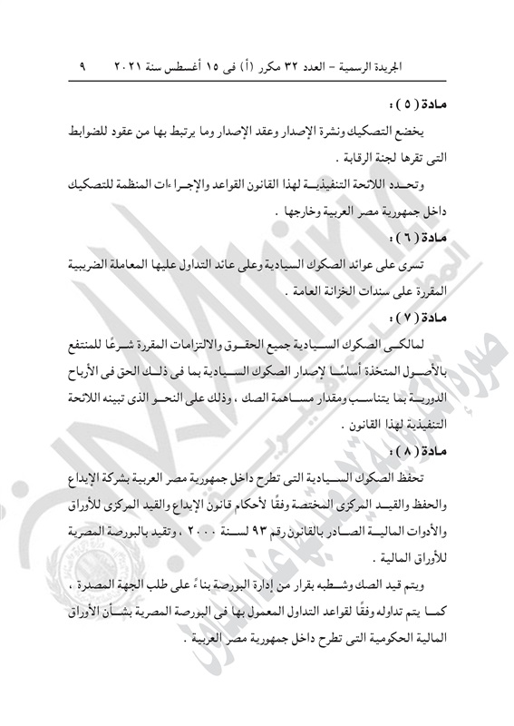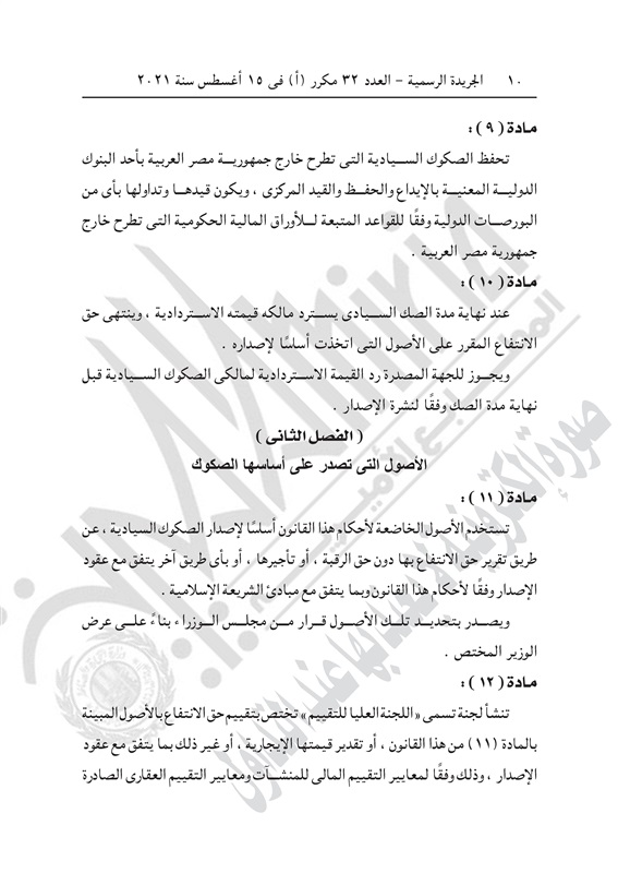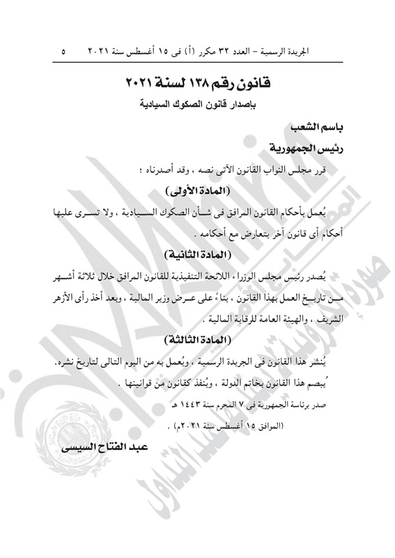 أخبار مصر السيسي يوافق على إصدار قانون الصكوك السيادية الأربعاء 18 أغسطس 2021 - 04:14 م 8/18/2021 4:14:00 PM الرئيس عبد الفتاح السيسي المصدر - خاص طباعة شارك نشرت الجريدة الرسمية في العدد رقم 32 مكرر "أ"، فى 15 أغسطس 2021، قرار رئيس الجمهورية بالتصديق على القانون رقم 138 لسنة 2021، بشأن إصدار قانون الصكوك السيادية.وفيما يلى نص القرار: طباعة شارك رئيس الجمهورية الصكوك السيادية الرئيس السيسي الجريدة الرسمية تابع المصدر علي جوجل نيوز تطبيق نبض