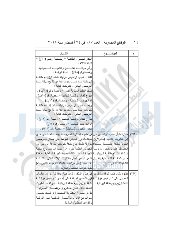 نشرت الوقائع المصرية في العدد 187، بتاريخ 24 أغسطس 2021، قرارات مجلس إدارة جهاز تنظيم مرفق الكهرباء وحماية المستهلك الصادرة بالجلسة الثامنة للعام المالى 2020-2021 المنعقدة بتاريخ 24-5-2021، بشأن تراخيص إنتاج – توزيع الطاقة الكهربائية.