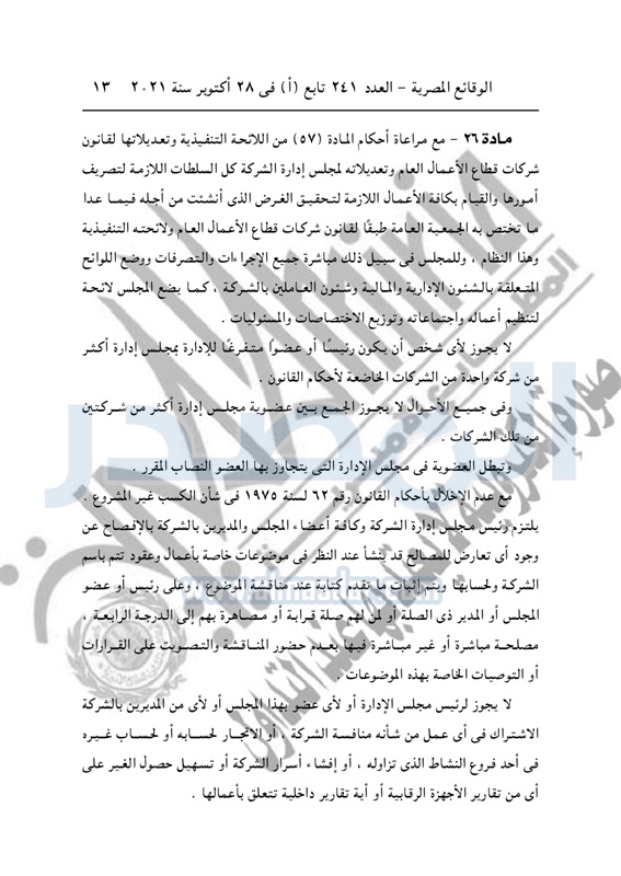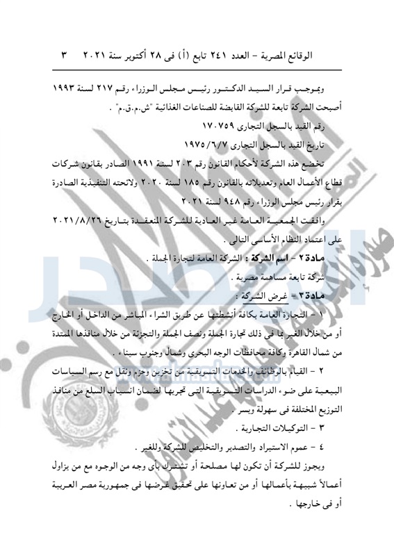 نشرت الوقائع المصرية في العدد 241 تابع "أ"، بتاريخ 28 أكتوبر 2021، قرار الجمعية العامة غير العادية للشركة العامة لتجارة الجملة بجلستها المنعقدة بتاریخ 26-8-2021.