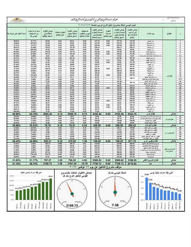كما تم طرح اعمال تأهيل مساقى بأطوال 466 كيلومتر، وتم الانتهاء من تأهيل مساقى بأطوال 29 كيلومتر، وجارى العمل في باقى الاطوال.
