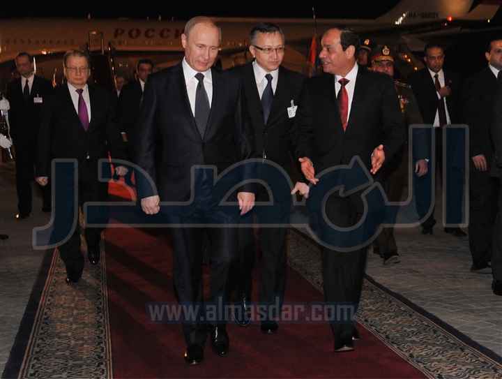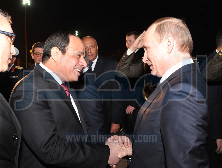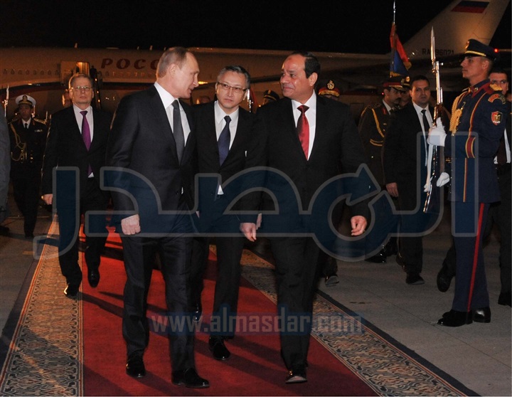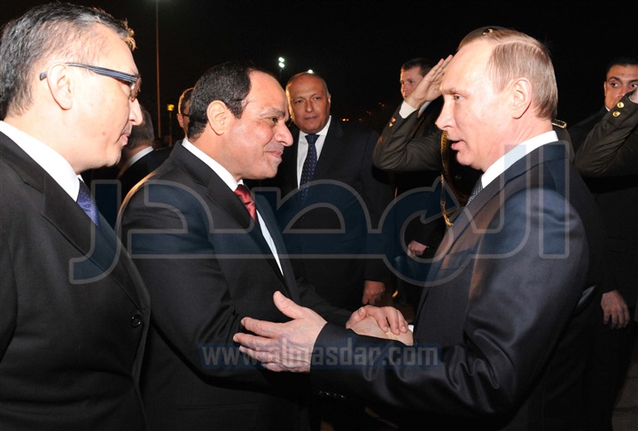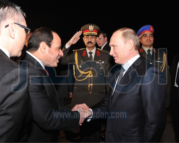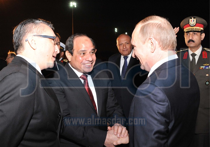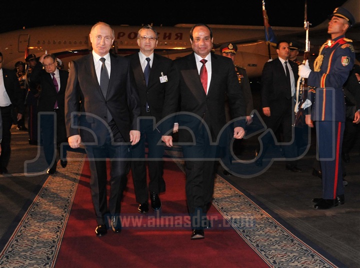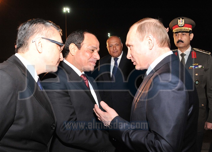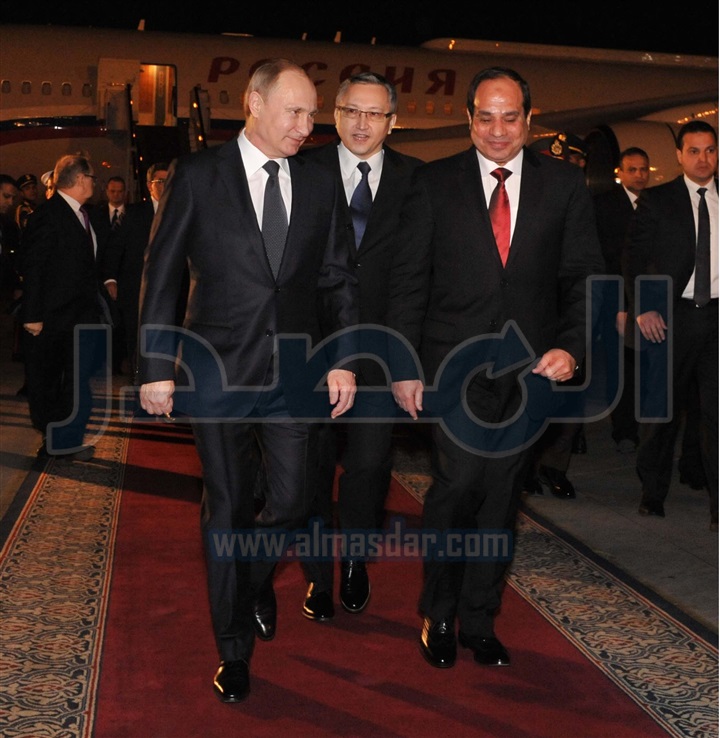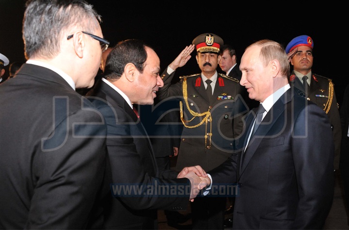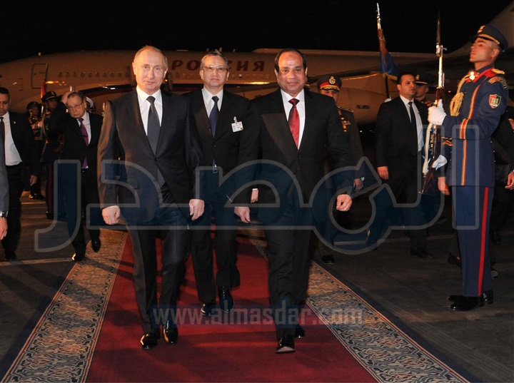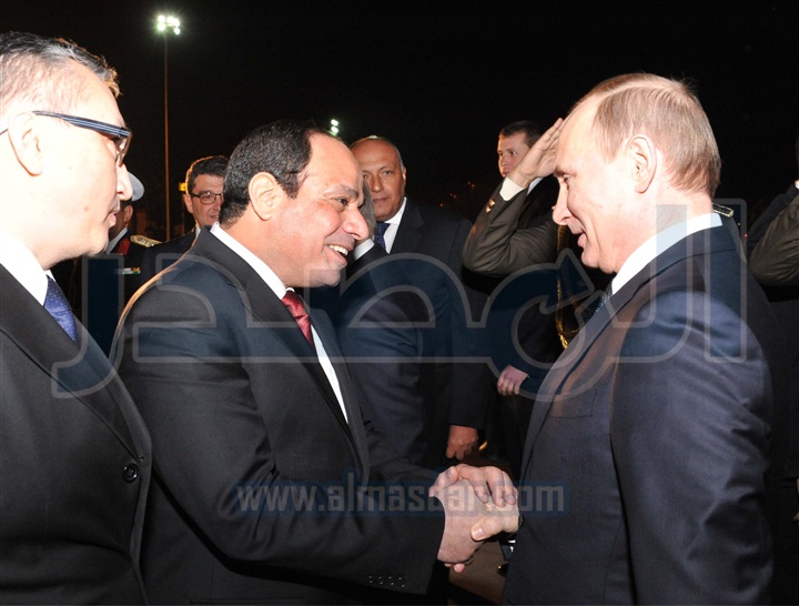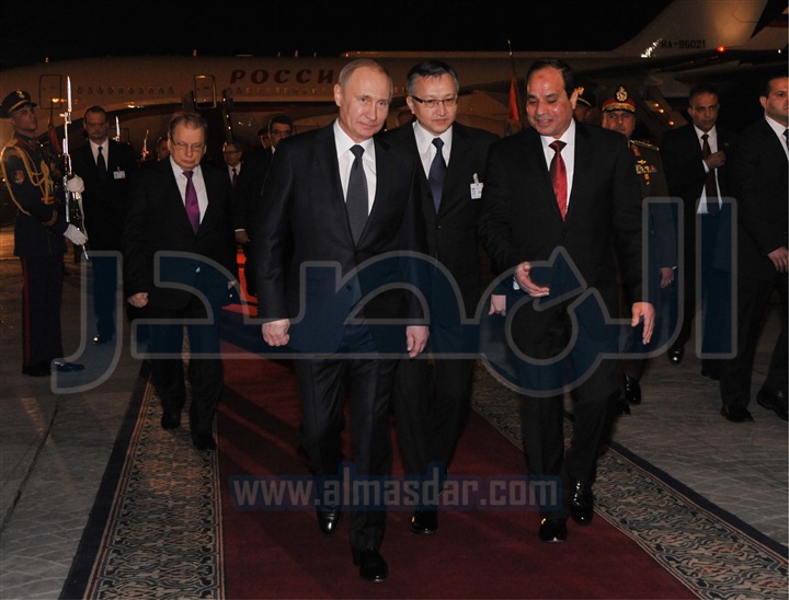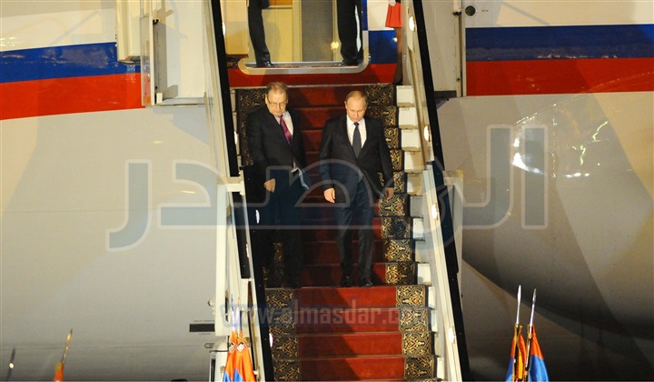 وكان في استقبال «بوتين» بالصالة الرئاسية، الرئيس عبد الفتاح السيسي، والمهندس إبراهيم محلب، رئيس مجلس الوزراء، والفريق أول صدقي صبحي، القائد العام للقوات المسلحة، وزير الدفاع والإنتاج الحربي.