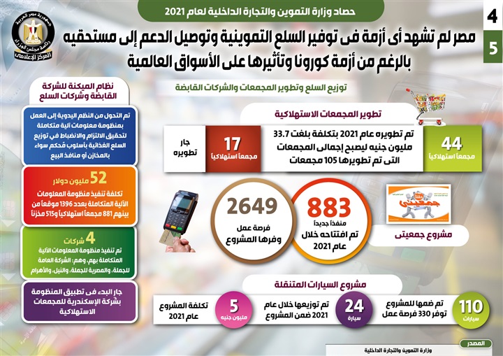 وبالإضافة إلى ما سبق، تناول التقرير الحديث عن جهود توزيع السلع وتطوير المجمعات والشركات القابضة، ومنها تطوير المجمعات الاستهلاكية، حيث تم تطوير 44 مجمعاً استهلاكياً بتكلفة بلغت 33.7 مليون جنيه، ليصبح إجمالي المجمعات التي تم تطويرها 105 مجمعات، بينما يجري تطوير 17 مجمعاً استهلاكياً، كما أشار التقرير إلى أنه تم افتتاح 883 منفذاً جديداً لمشروع جمعيتي، وفرت 2649 فرصة عمل، وذلك خلال عام 2021.