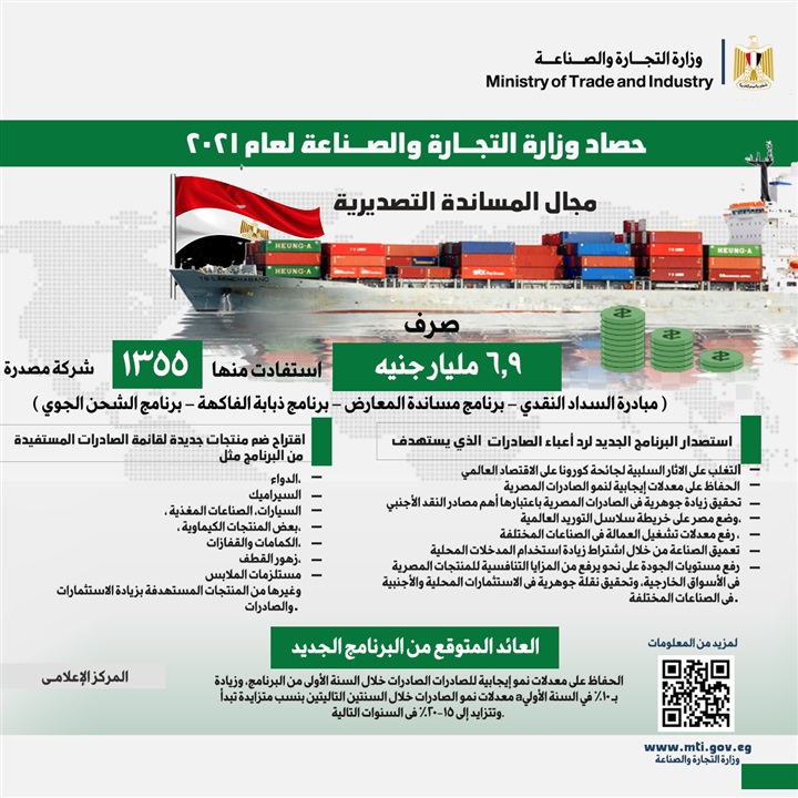 «التجارة»: 6.9 مليار جنيه إجمالي المساندة التصديرية لـ1355 شركة في 2021