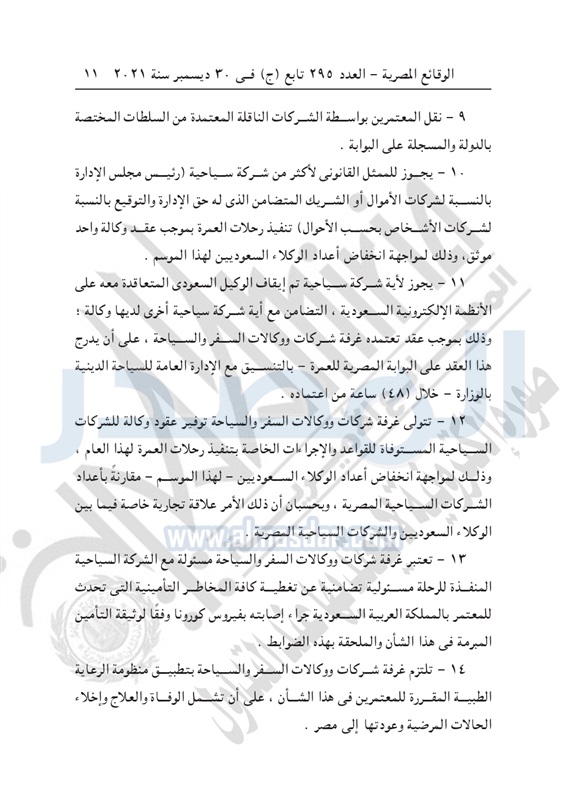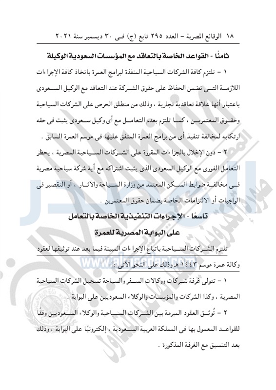 نشرت الوقائع المصرية في العدد 295 تابع "ج"، بتاريخ 30 ديسمبر 2021، قرار وزارة السياحة والآثار رقم 331 لسنة 2021 صادر بتاريخ 30-12-2021، بشأن القواعد والاجراءات المنظمة لتنفيذ رحلات العمرة لموسم 1443 هـ بالقواعد والاجراءات المرفقة بهذا القرار.