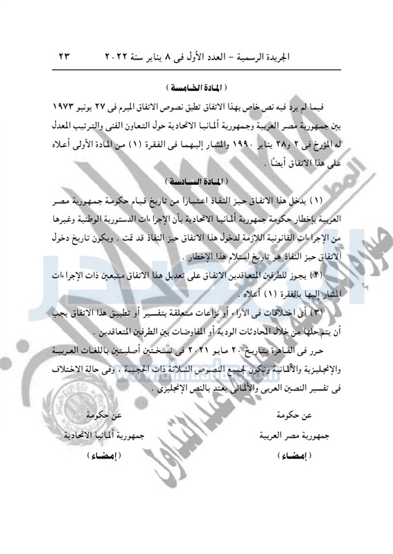 نشرت الجريدة الرسمية في العدد الأول، بتاريخ 8 يناير 2022، قرار رئيس جمهورية مصر العربية بالتصديق على القانون رقم 311 لسنة 2021، بشأن الموافقة على الاتفاق بين حكومة جمهورية مصر العربية وحكومة جمهورية ألمانيا الاتحادية بشأن التعاون الفنى لعام 2019 الموقع فى القاهرة بتاريخ 20-5-2021.