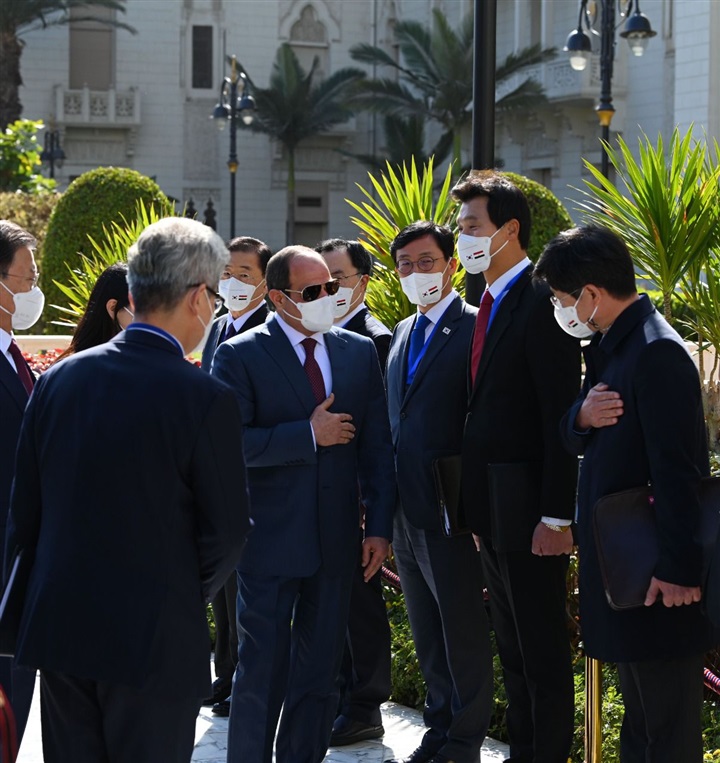 وأعرب الرئيس الكوري عن سعادته بزيارة مصر للمرة الأولى، موجهاً الشكر للرئيس على حفاوة الاستقبال وكرم الضيافة، ومعرباً عن الحرص على استمرار التنسيق والتشاور بين البلدين الصديقين في مختلف المجالات، وكذلك التطلع لتطوير وتعزيز علاقات كوريا الجنوبية مع مصر، لا سيما في ظل دورها المحوري بقيادة الرئيس لإرساء دعائم الاستقرار والأمن في منطقة الشرق الأوسط والقارة الأفريقية، بالإضافة إلى اهتمام الجانب الكوري بزيادة استثماراته في المشروعات التنموية الكبرى ومشروعات البنية الأساسية في مصر، وكذا المشروعات الأخرى في جميع القطاعات.