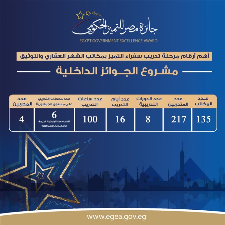 اختتمت جائزة مصر للتميز الحكومي فعاليات تدريب سفراء التميز لعدد 135 مكتب شهر عقاري وتوثيق مميكن على مستوى الجمهورية، بمحافظات القاهرة، قنا، المنوفية، أسيوط، الإسكندرية، الإسماعيلية، وذلك استعدادًا للإعلان عن فتح باب الترشح لجائزة التميز الداخلي بتلك المكاتب.