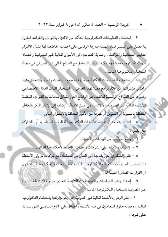 نشرت الجريدة الرسمية في العدد 5 مكرر "د"، بتاريخ 8 فبراير 2022، قرار رئيس جمهورية مصر العربية بالتصديق على القانون رقم 5 لسنة 2022، بشأن إصدار قانون تنظيم وتنمية استخدام التكنولوجيا المالية في الأنشطة المالية غير المصرفية.