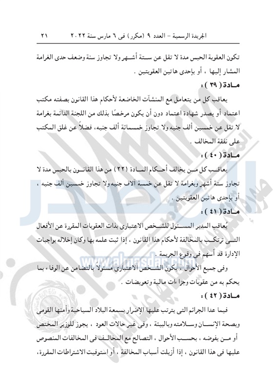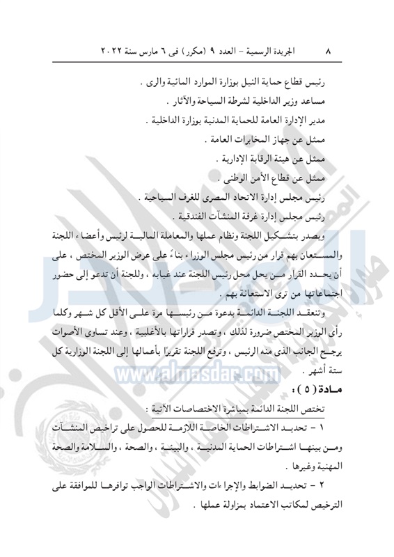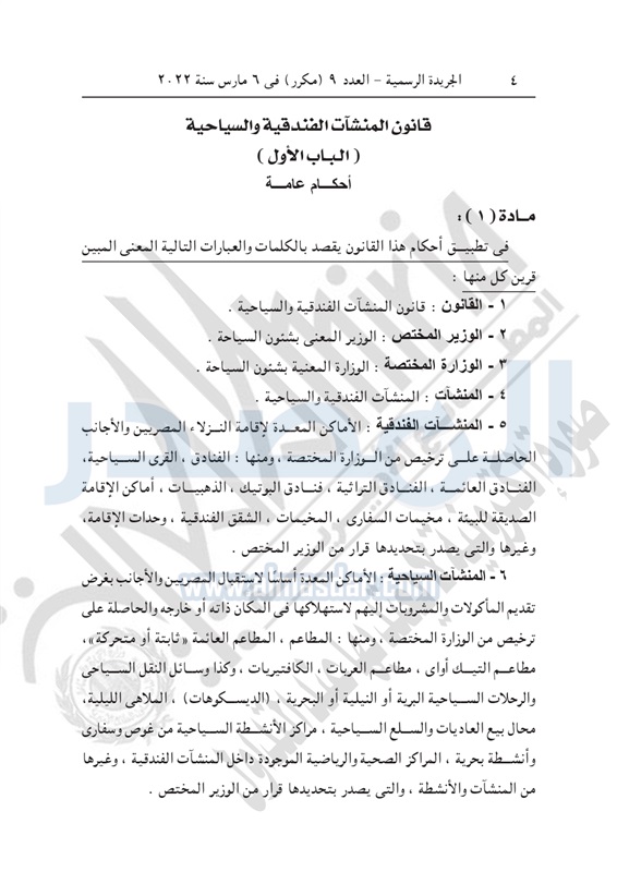 نشرت الجريدة الرسمية في العدد 9 "مكرر"، بتاريخ 6 مارس 2022، قرار رئيس جمهورية مصر العربية بالتصديق على القانون رقم 8 لسنة 2022، بشأن إصدار قانون المنشأت الفندقية والسياحية.