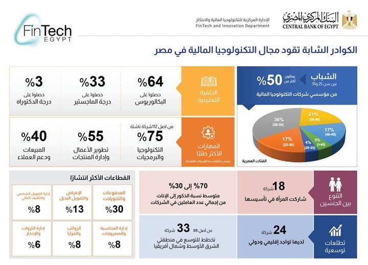 كشف تقرير منظور التكنولوجيا المالية في مصر 2021، الصادر مؤخرًا عن مبادرة "فينتك إيجيبت" التابعة للبنك المركزي المصري، أن أعمار مؤسسي الشركات العاملة في مجال التكنولوجيا المالية تتراوح ما بين 25 إلى 35 عامًا "يمثلون نسبة أكثر من 50%".