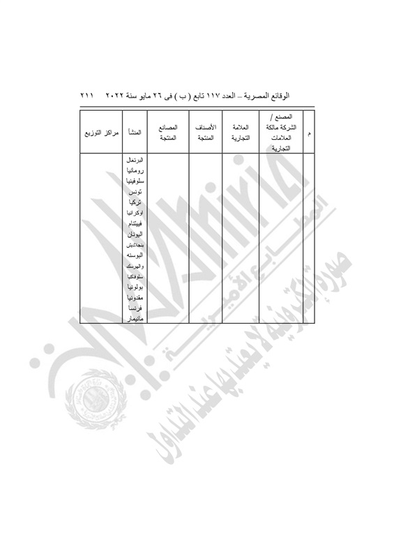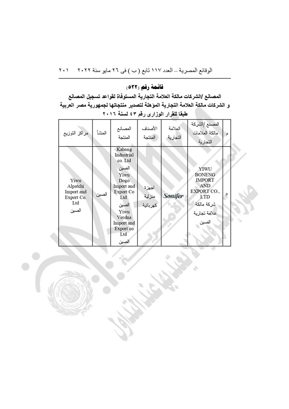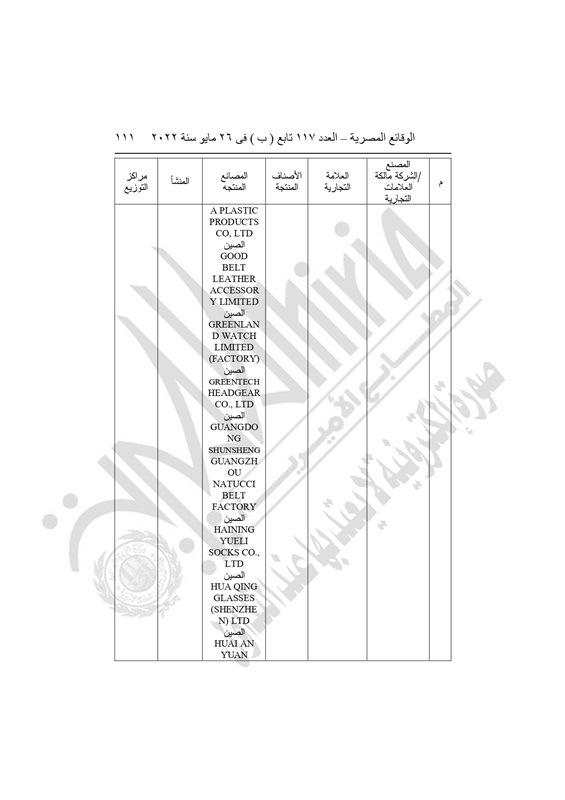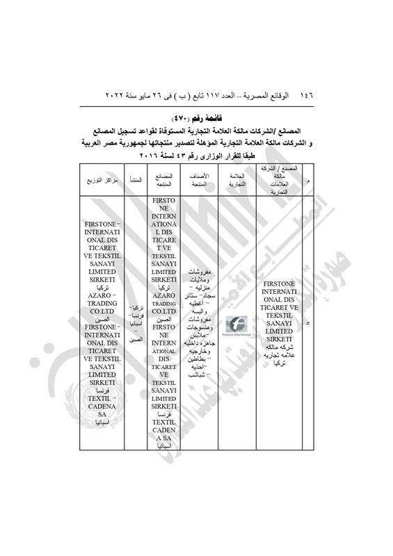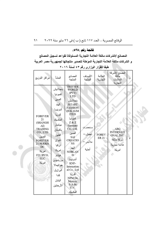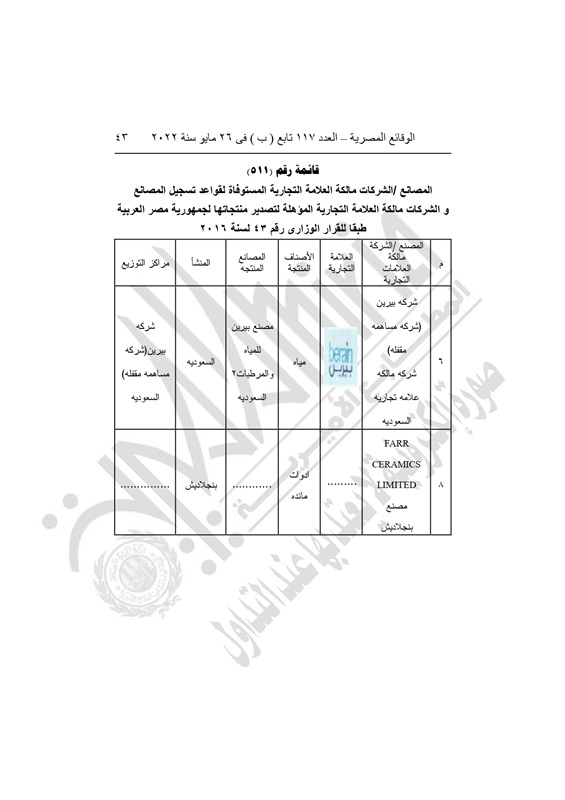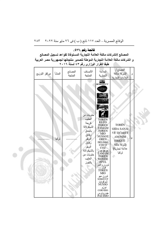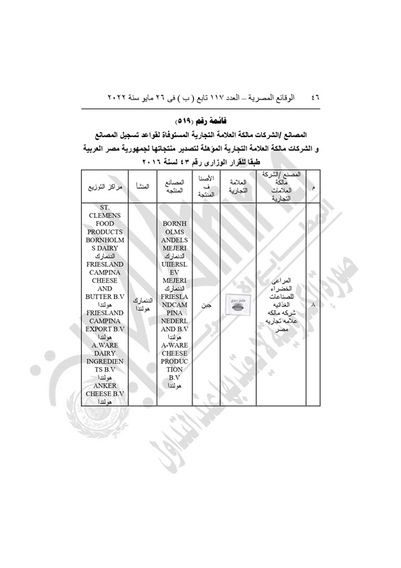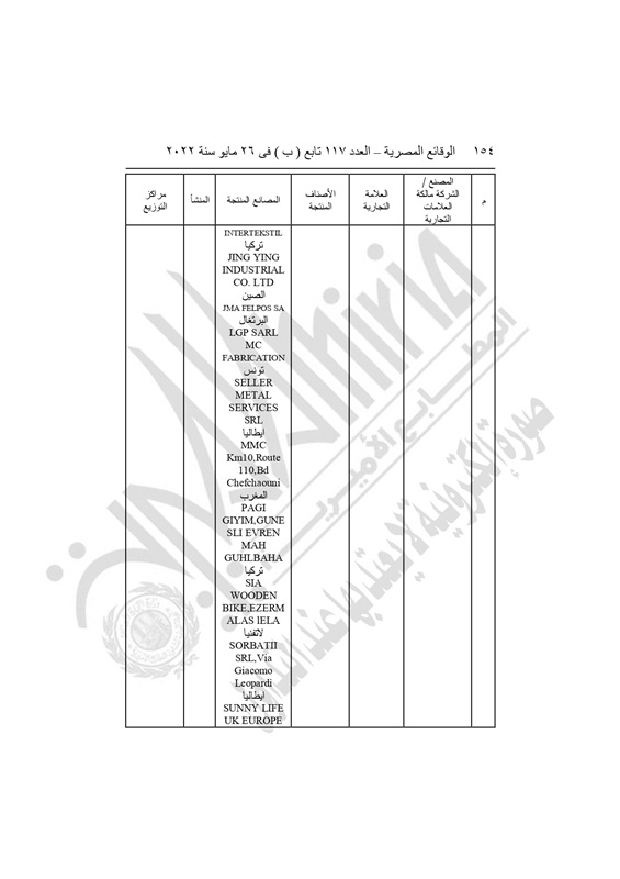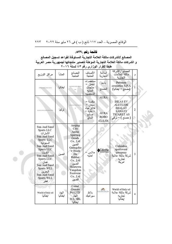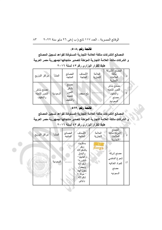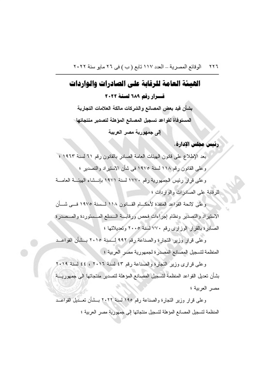 نشرت الوقائع المصرية في العدد 127 تابع "أ"، "ب"، بتاريخ 27 يونية، 26 مايو 2022، قرار الهيئة العامة للرقابة الصادرات والواردات على رقمى 770، 573 لسنة 2022، بشأن قيد بعض المصانع والشركات مالكة العلامات التجارية المستوفاه لقواعد تسجيل المصانع المؤهلة تصدير منتجاتها إلى جمهورية مصر العربية.