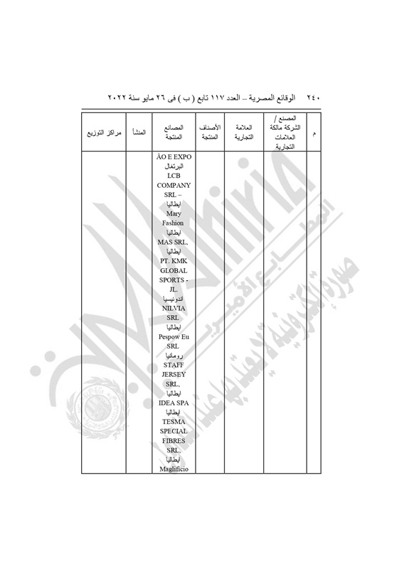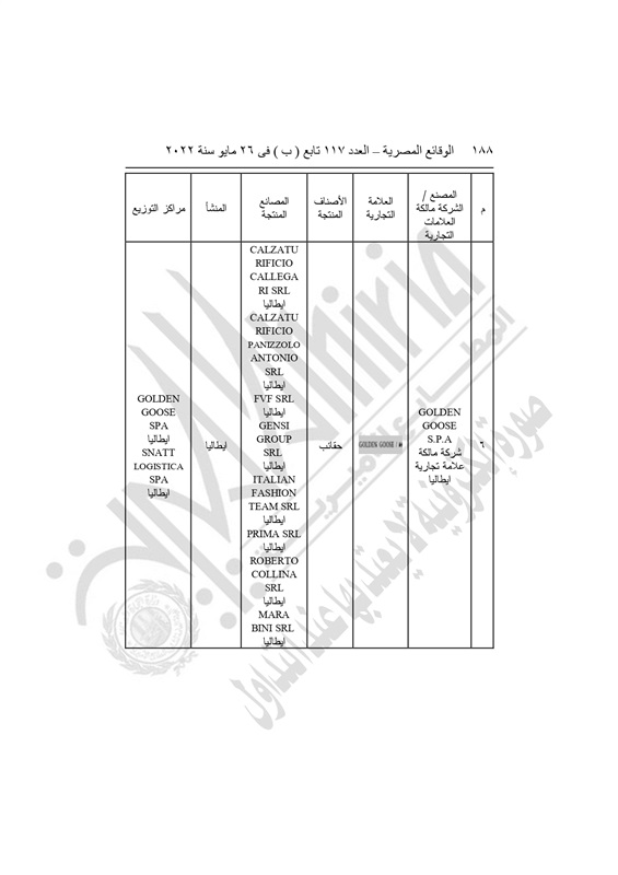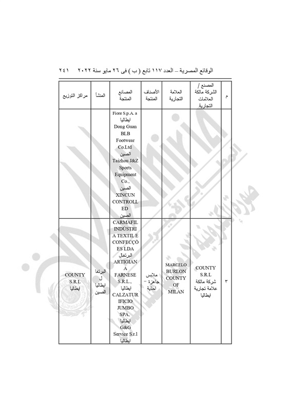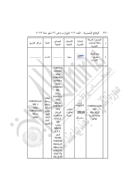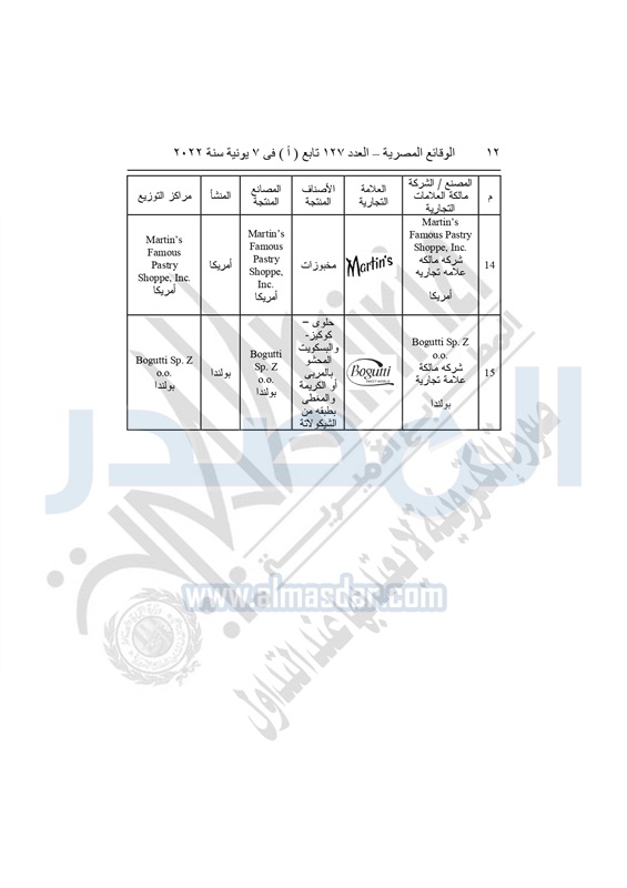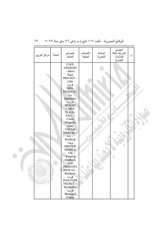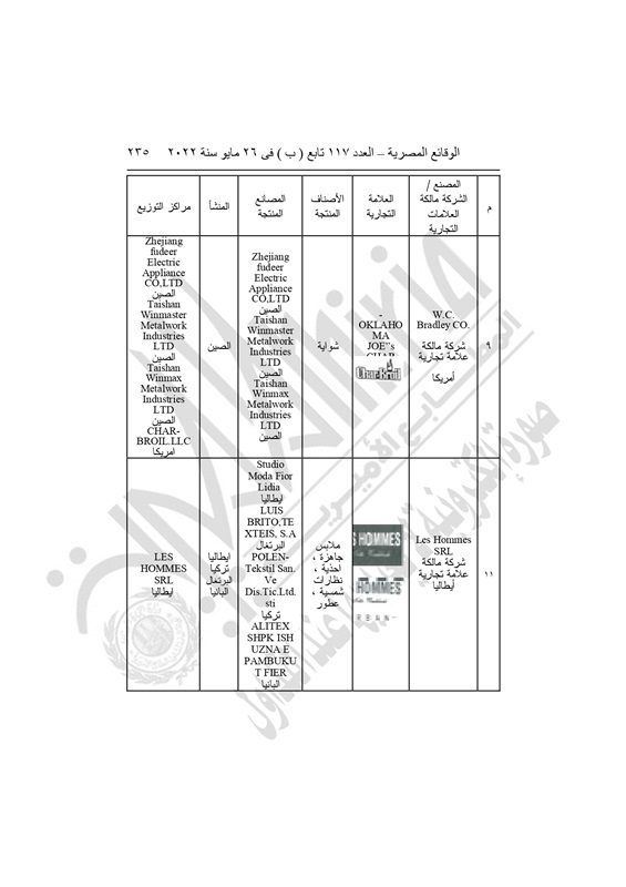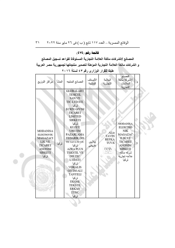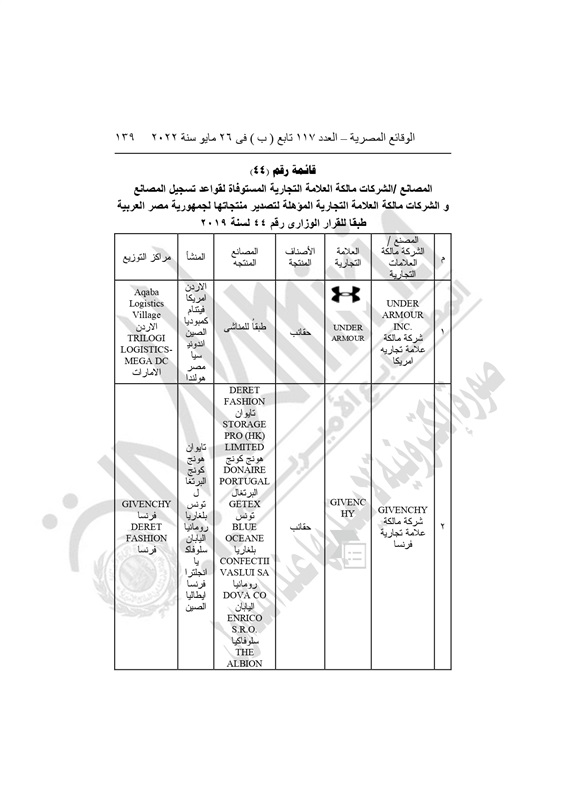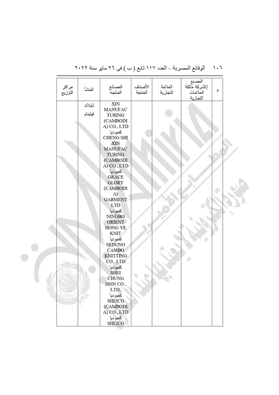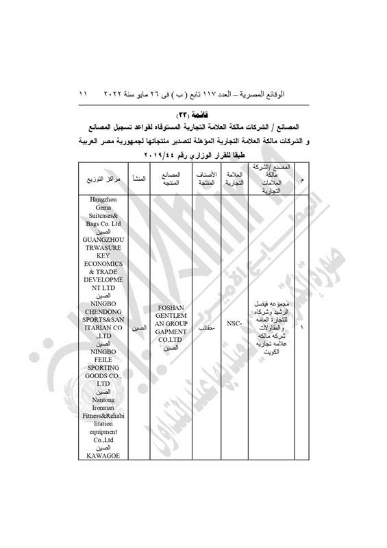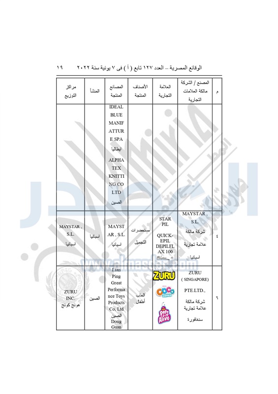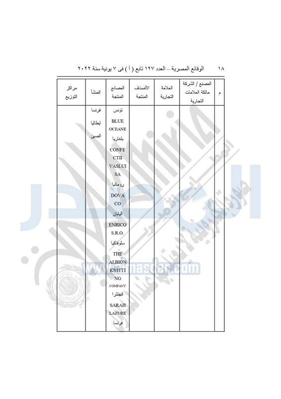 نشرت الوقائع المصرية في العدد 127 تابع "أ"، "ب"، بتاريخ 27 يونية، 26 مايو 2022، قرار الهيئة العامة للرقابة الصادرات والواردات على رقمى 770، 573 لسنة 2022، بشأن قيد بعض المصانع والشركات مالكة العلامات التجارية المستوفاه لقواعد تسجيل المصانع المؤهلة تصدير منتجاتها إلى جمهورية مصر العربية.