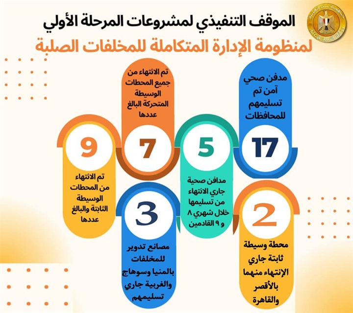 وأشار إلى أنه تم الانتهاء من جميع المحطات الوسيطة المتحركة بعدد 7 محطات، بالإضافة إلى الإنتهاء من عدد 9 محطات وسيطة ثابتة وجاري الانتهاء من 2 محطتى إسنا بالأقصر والمظلات بالقاهرة وجاري أيضاً تسليم 3 مصانع لتدوير المخلفات بمحافظات المنيا وسوهاج والغربية.