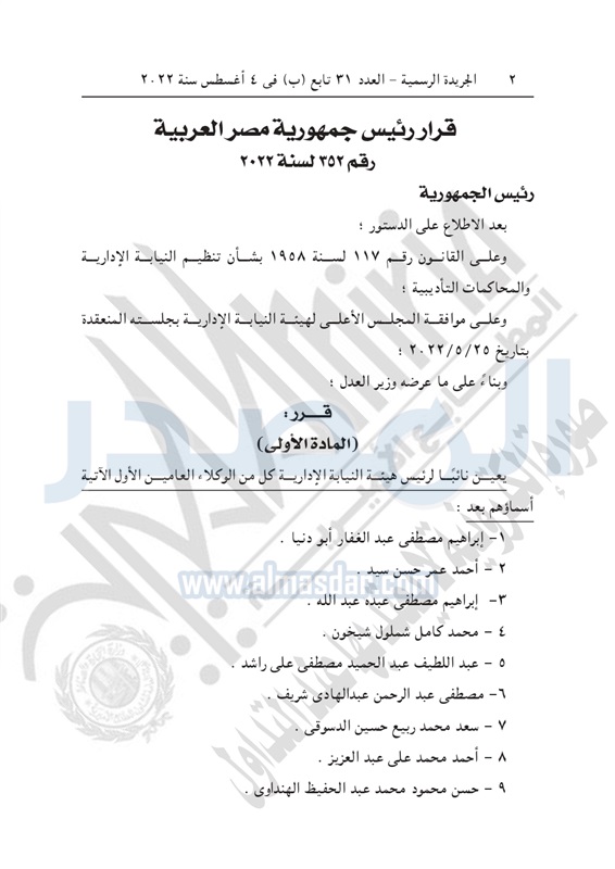 أصدر الرئيس عبدالفتاح السيسي قرارا برقم 352 لسنة 2022 بتعيين 115 من الوكلاء العامين الأول لهيئة النيابة الإدارية في وظيفة نائب لرئيس الهيئة.