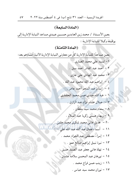 كما تضمن القرار تعيين 155 من الوكلاء العامين لهيئة النيابة الإدارية في وظيفة وكيل عام أول للنيابة الإدارية.