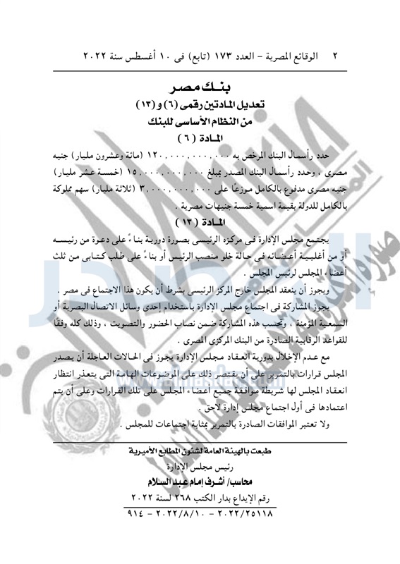 نشرت الوقائع المصرية في العدد 173 "تابع"، بتاريخ 10 أغسطس 2022، قرار بنك مصر، بشأن تعديل المادتين رقمي "6" و"13" من النظام الأساسي للبنك.