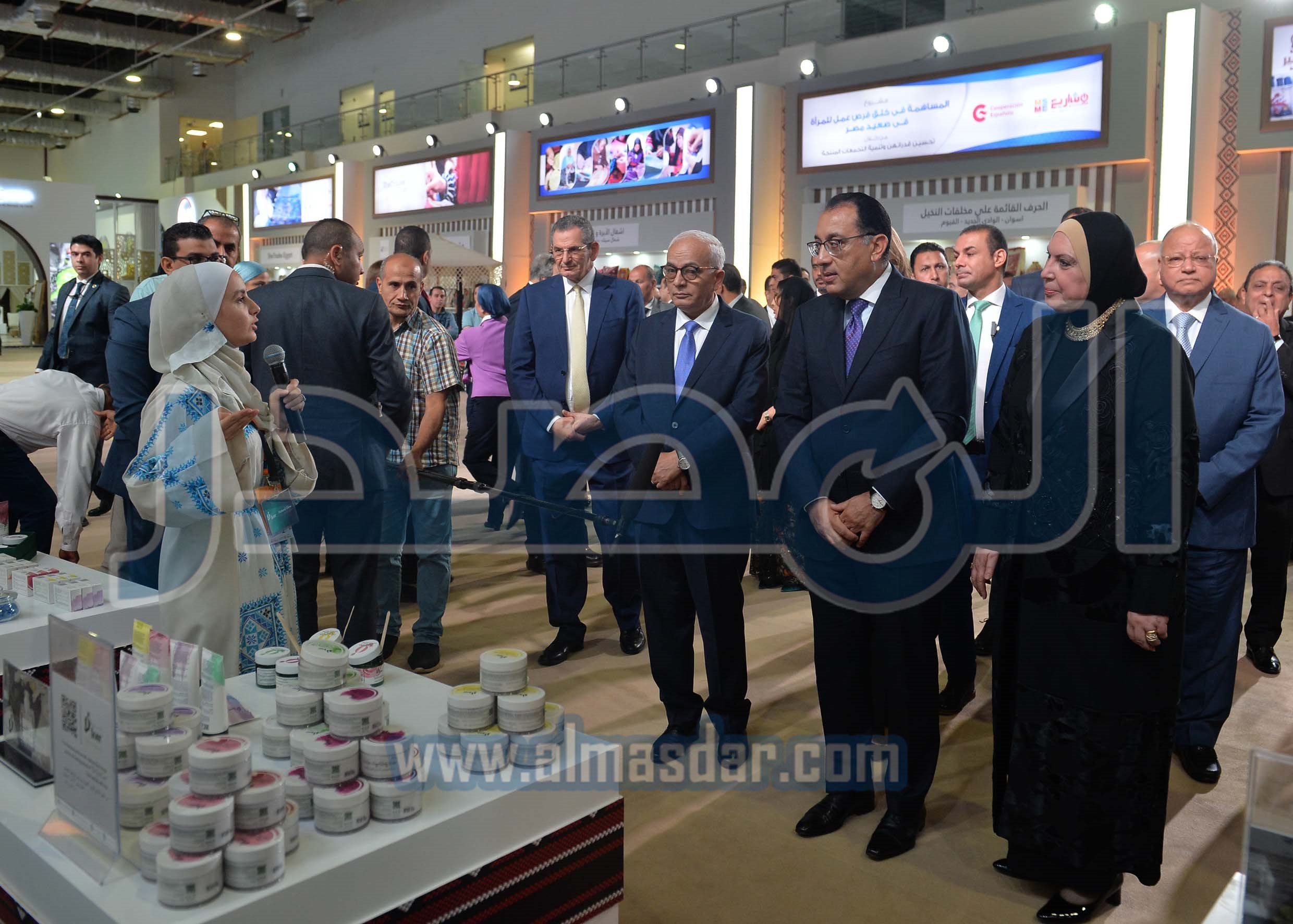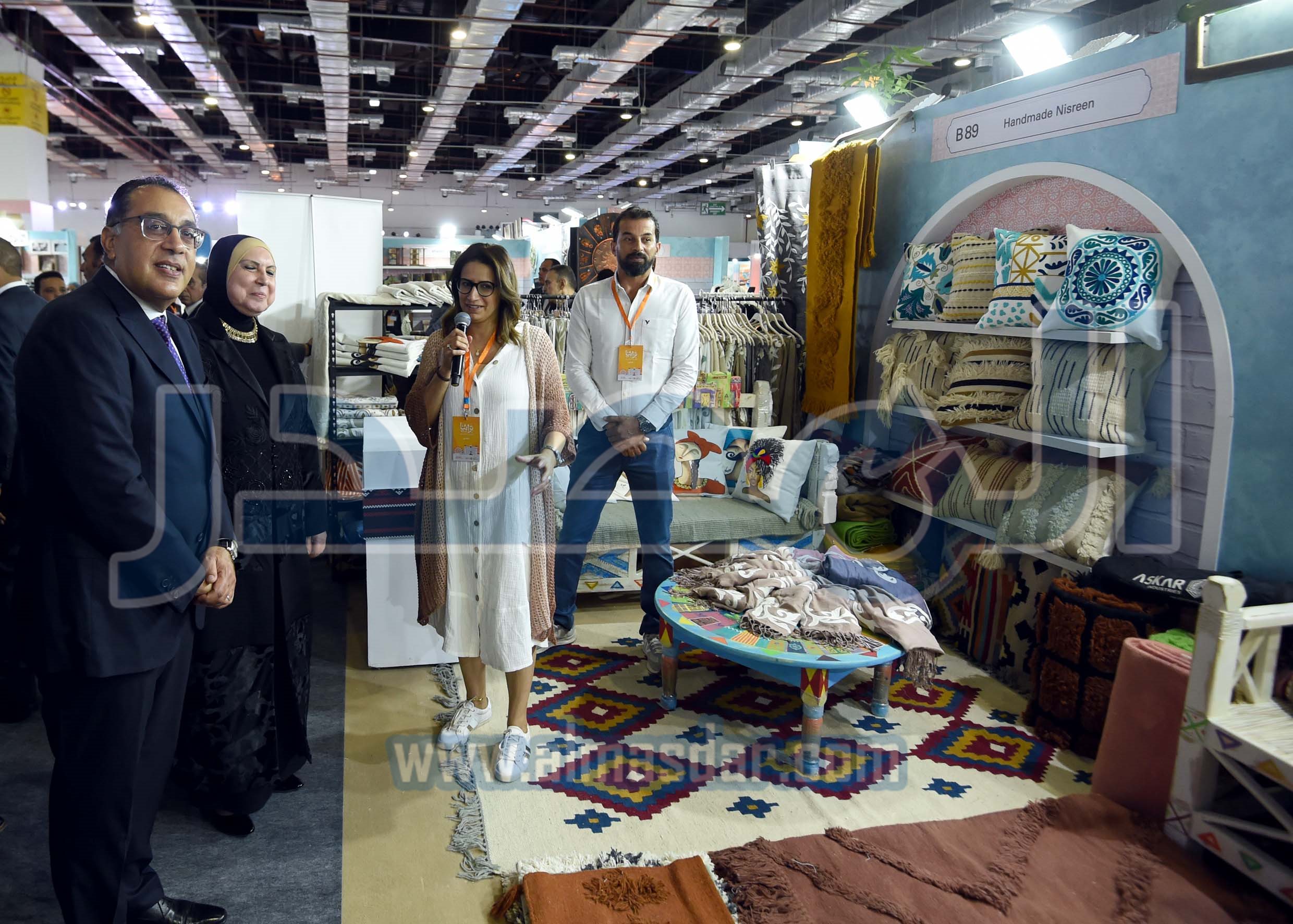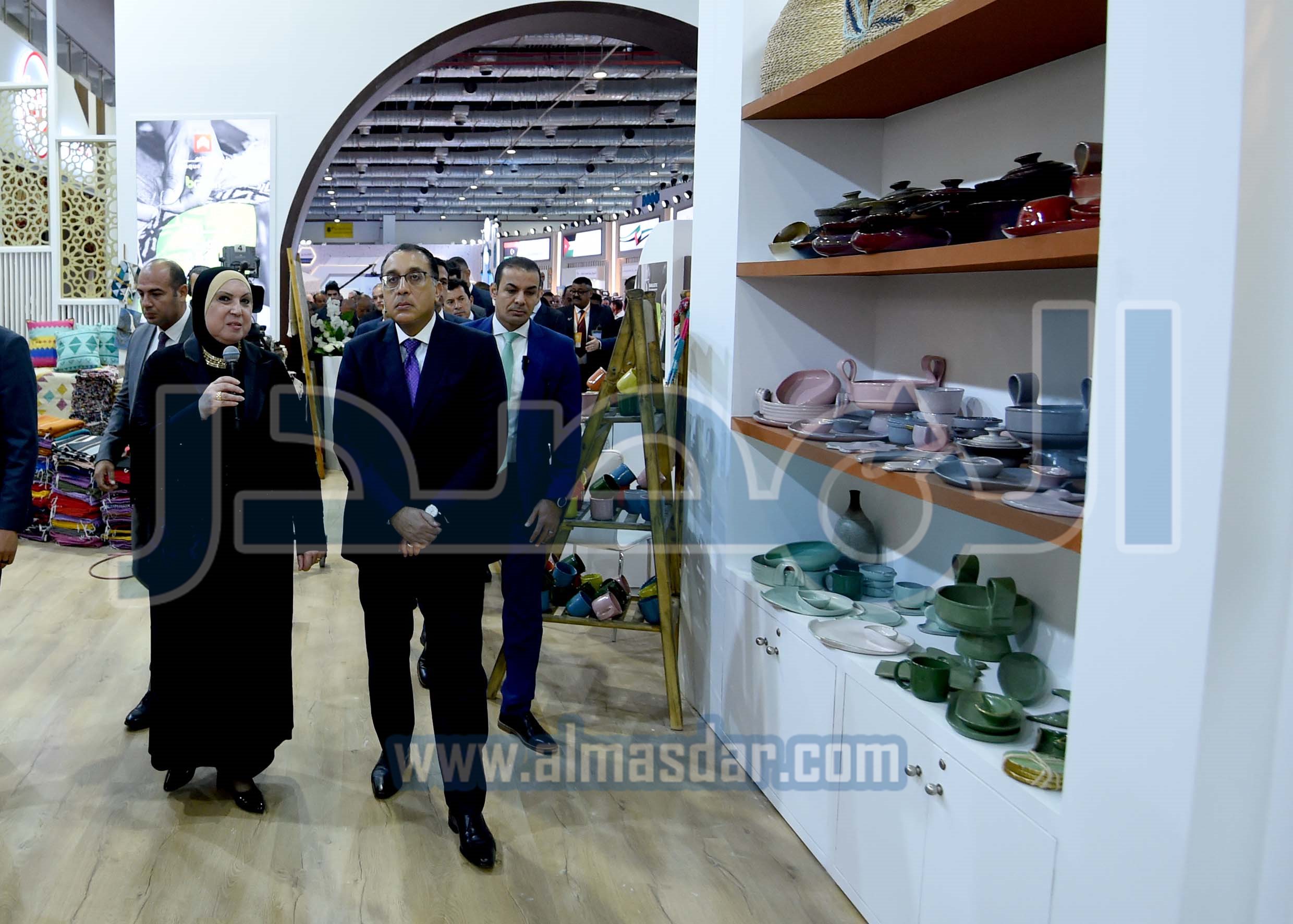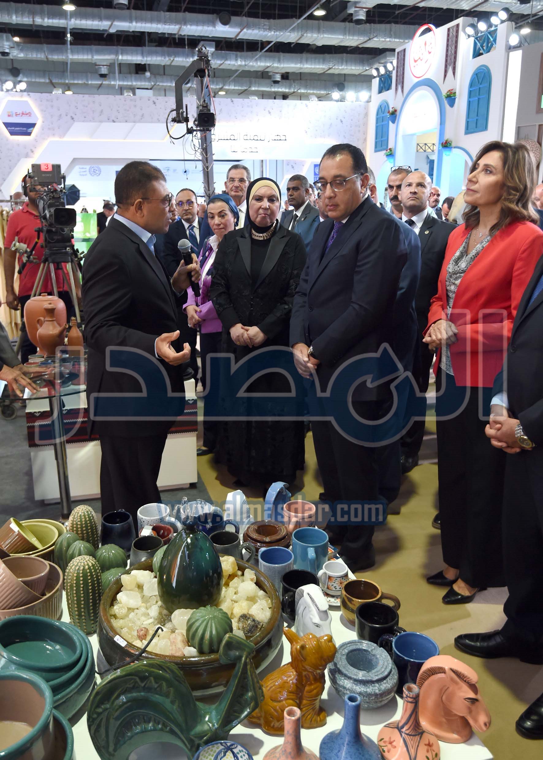 وترجل رئيس الوزراء، ومرافقوه، فى أرجاء المعرض، حيث زار وتفقد العديد من الأجنحة الخاصة بالأعمال والحرف اليدوية والتراثية، والتى تتضمن المنتجات الزجاجية، والمنسوجات، والمنتجات النحاسية، وكذا منتجات الخيامية والارابيسك، ومن بين تلك الأجنحة، الجناح المخصص لمنتجات أصحاب المشروعات من قرى ومراكز المبادرة الرئاسية "حياة كريمة" الذين تم تمويل مشروعاتهم وتطوير منتجاتها من جانب جهاز تنمية المشروعات المتوسطة والصغيرة ومتناهية الصغر.