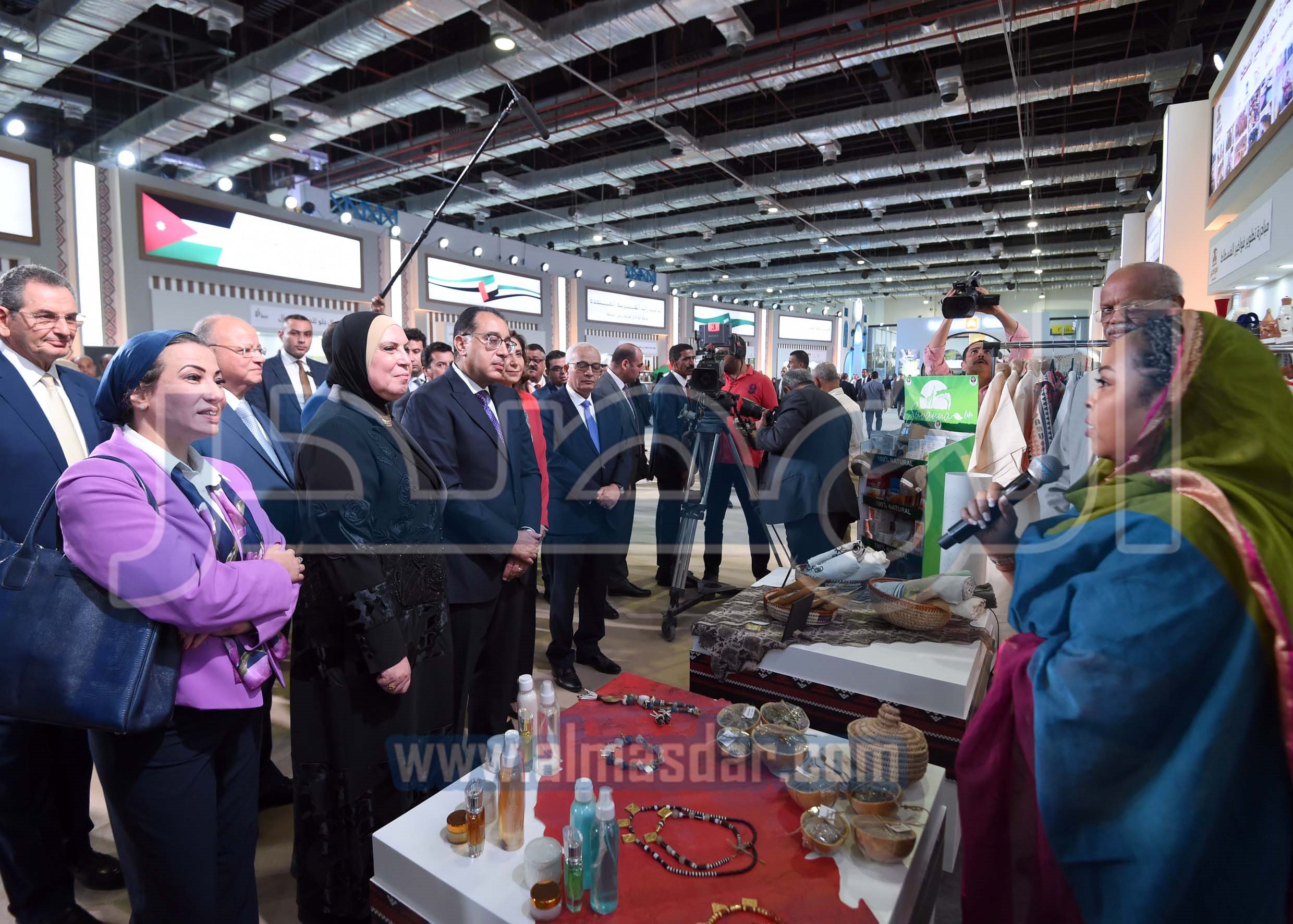 وقام الدكتور مصطفى مدبولي، ومرافقوه بجولة في أرجاء المعرض شملت جناح المملكة العربية السعودية، ضيف شرف المعرض، وكذا أجنحة كل من الإمارات العربية المتحدة، والمملكة الأردنية الهاشمية، والسودان، وليبيا، حيث التقي رئيس الوزراء بعدد من العارضين من الدول الشقيقة، مؤكداً حرص الدولة المصرية على مشاركة العديد من الدول العربية في هذا المعرض، لعرض مختلف المنتجات اليدوية والتراثية التى تعبر عن الحضارات الثقافية والفولكلورية لهذه البلدان الشقيقة من الفنون الإبداعية المتميزة والمتفردة، التي تعكس الهوية العربية وحجم التنوع بين الشعوب والثقافات، منوهاً إلى أن ذلك يأتي فى إطار دعم وتعزيز أوجه التعاون فى مختلف المجالات والقطاعات، وخاصة الثقافية منها، مشيداً بالمستوى الابداعي والفني للمنتجات والأعمال المعروضة.