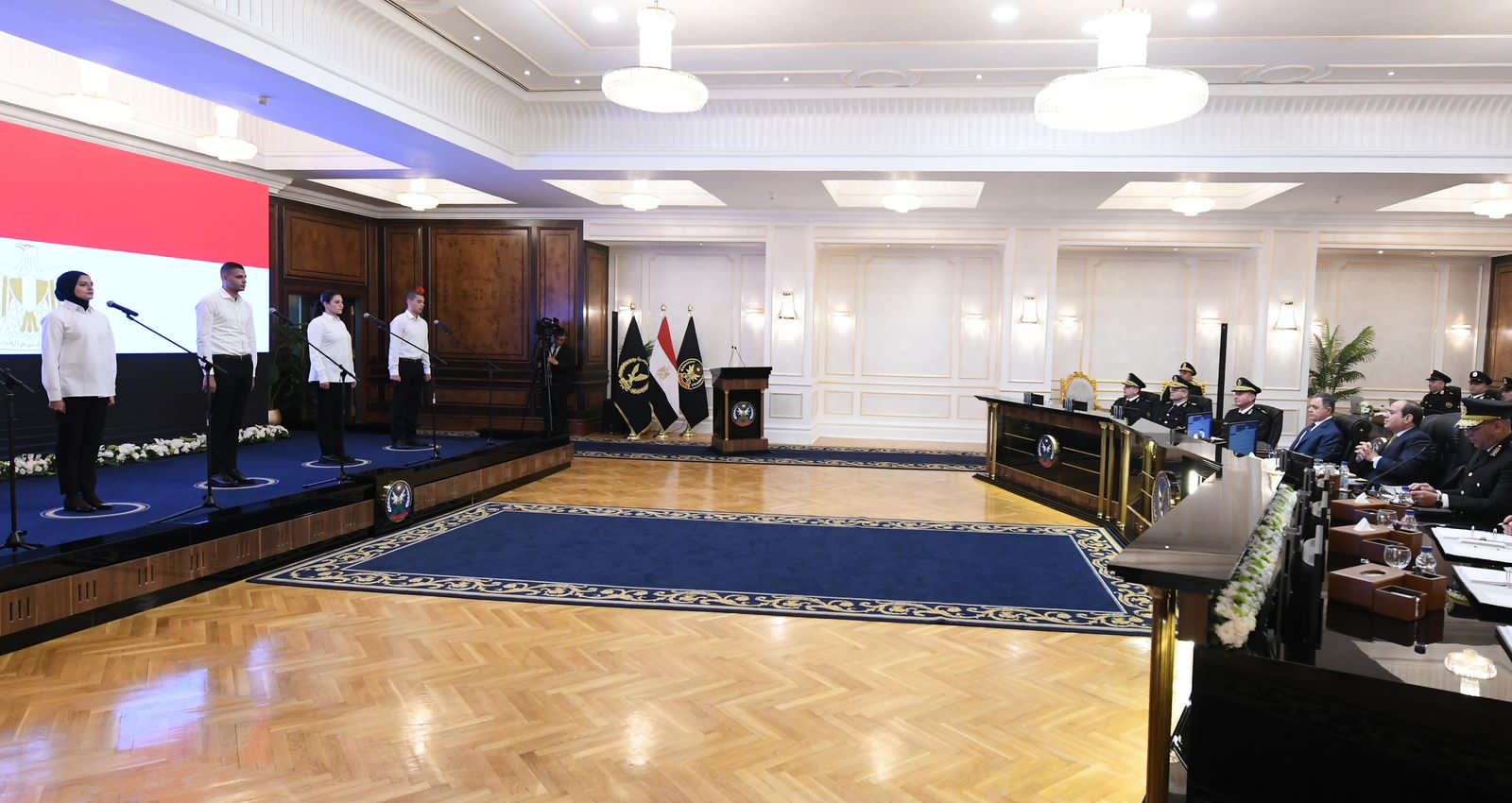 ودار حوار مفتوح ما بين الرئيس والطلبة والطالبات المتقدمين حول مجمل القضايا الدولية والاقليمية وكذلك جهود الدولة ذات الصلة بعملية التنمية، وما يواجه الدولة من تحديات متنوعة، حيث أوصاهم الرئيس بضرورة التسلح بالعلم والمعرفة ومواصلة الإطلاع بإنتظام ليشكلوا حائط صد منيع بجانب أشقائهم في الكليات والمعاهد العسكرية وكذلك في الجامعات والمعاهد المدنية ضد كافة التحديات التي تشاهدها الدولة المصرية.